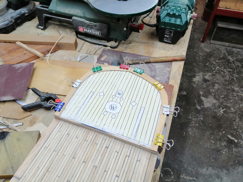 Klejenie desek pokładu rozpocząłem od środkowego pokładu. Zajęło mi to ok 5 godzin. Efekty prezentuje poniżej.