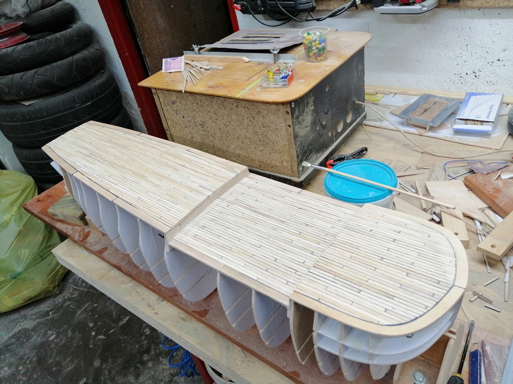 Schemat deskowania zastosowałem z tzw. metody co trzy, szerzej na ten temat można znaleźć pod linkiem: http://santisimatrinidad.jun.pl/viewtopic.php?t=1921. W tej chwili pokłady nie są jeszcze wyszlifowane. Zrobię to dopiero po wykonaniu poszycia kadłuba. Będzie to jedno wielkie szlifowanie.