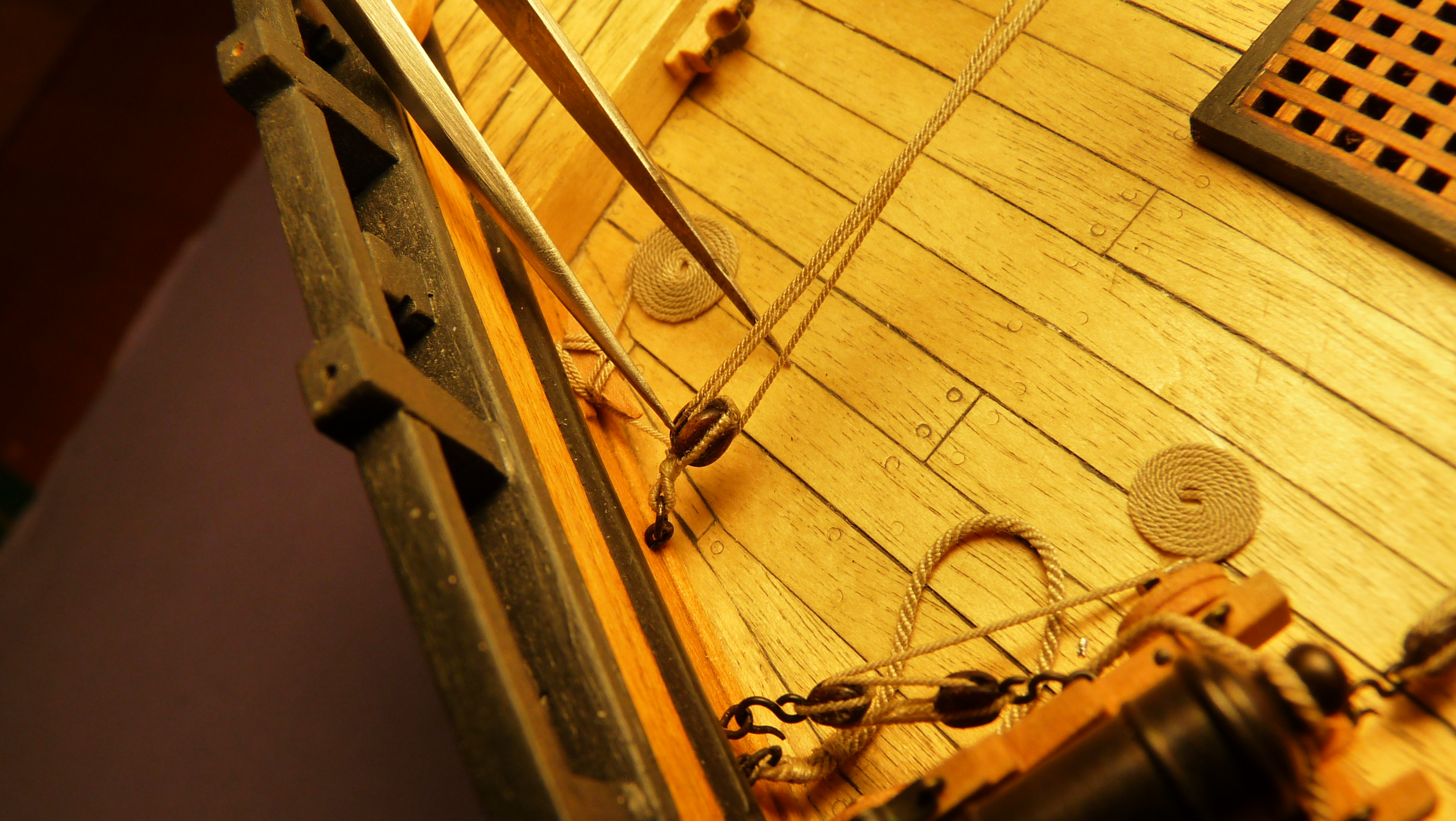 Przymocowałem ster (bloczki 4mm) i dokończyłem barierkę sznurową.