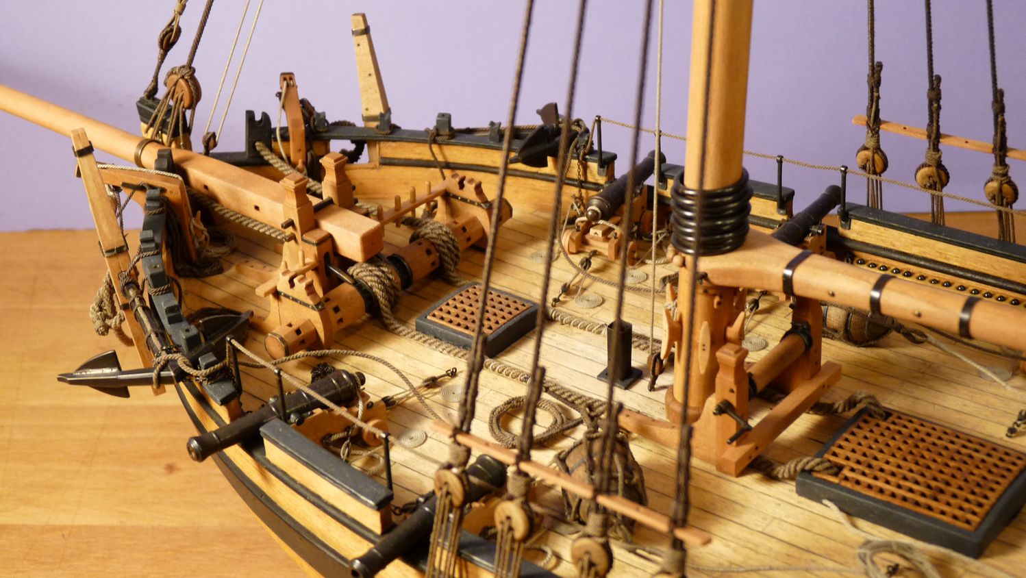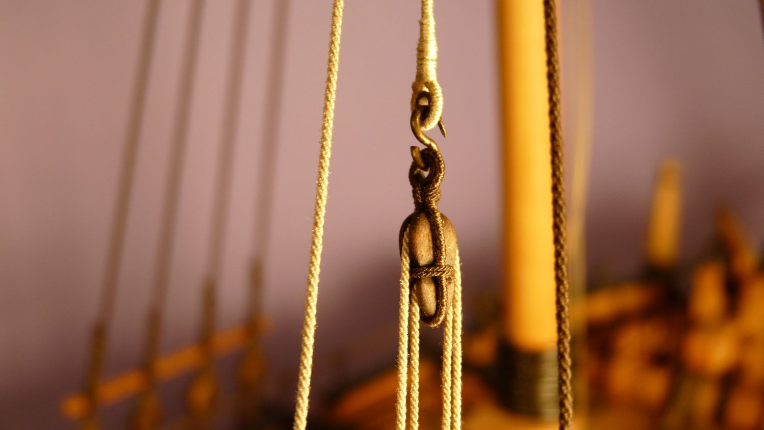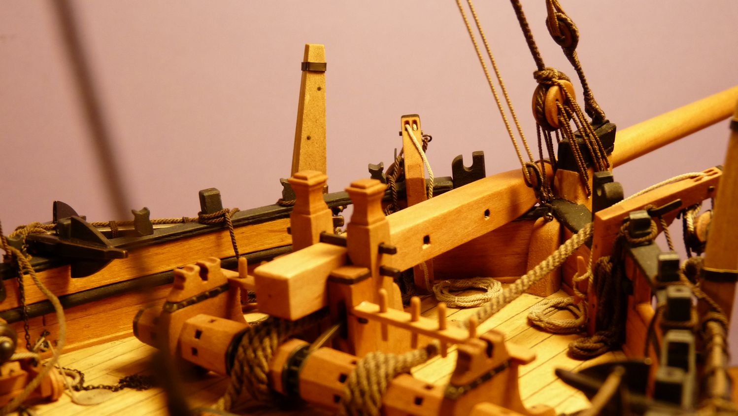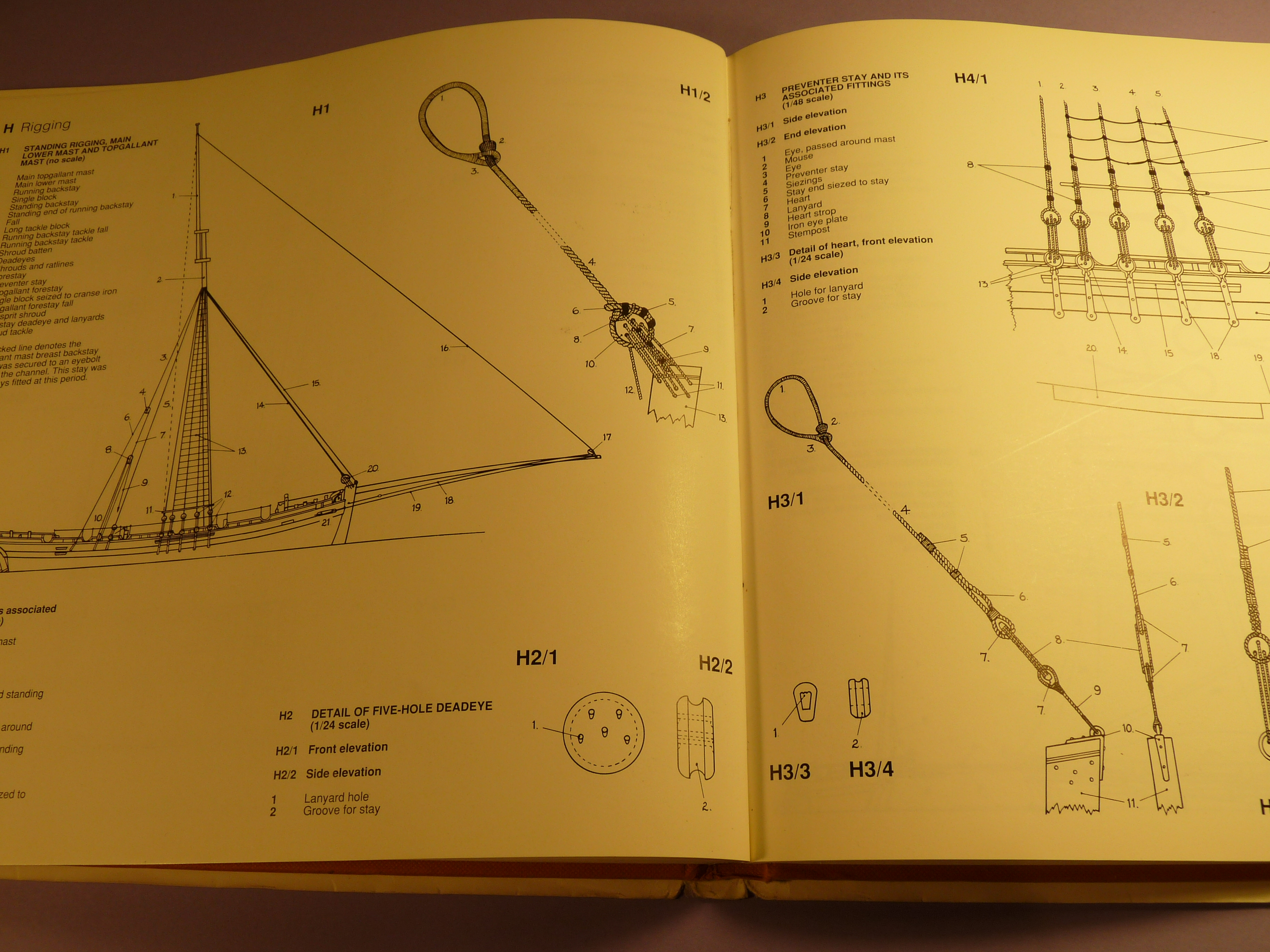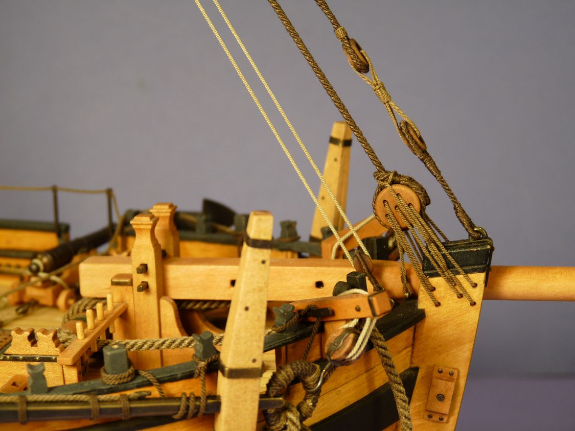 Ciekawy jest ten inny niz zazwyczaj jufers (czy moze heart?) z piecioma otworami i jego uzycie w talrepie do zamocowania foksztagu do kilu (stewy dziobowej) - widze cos takiego po raz pierwszy!