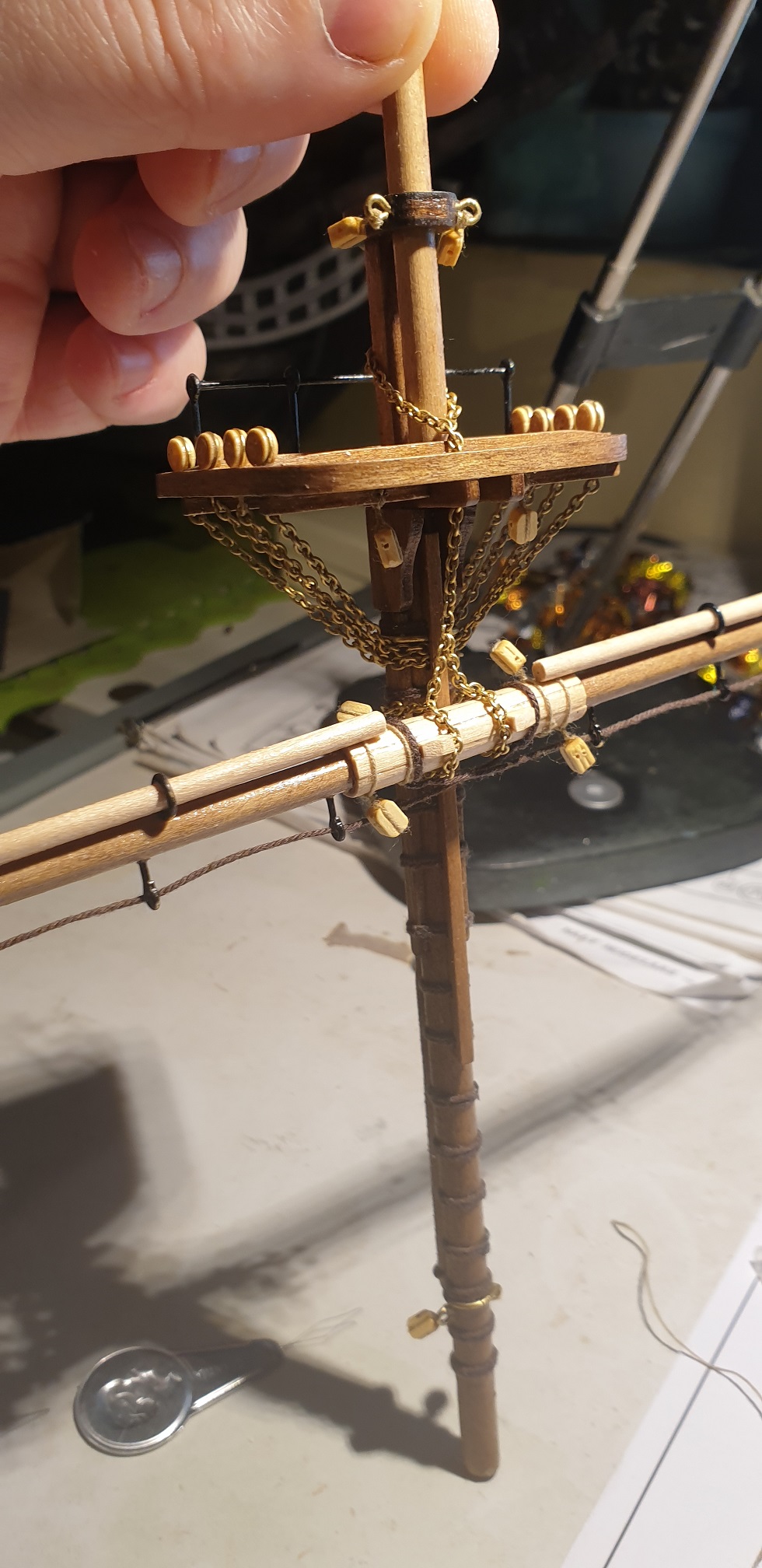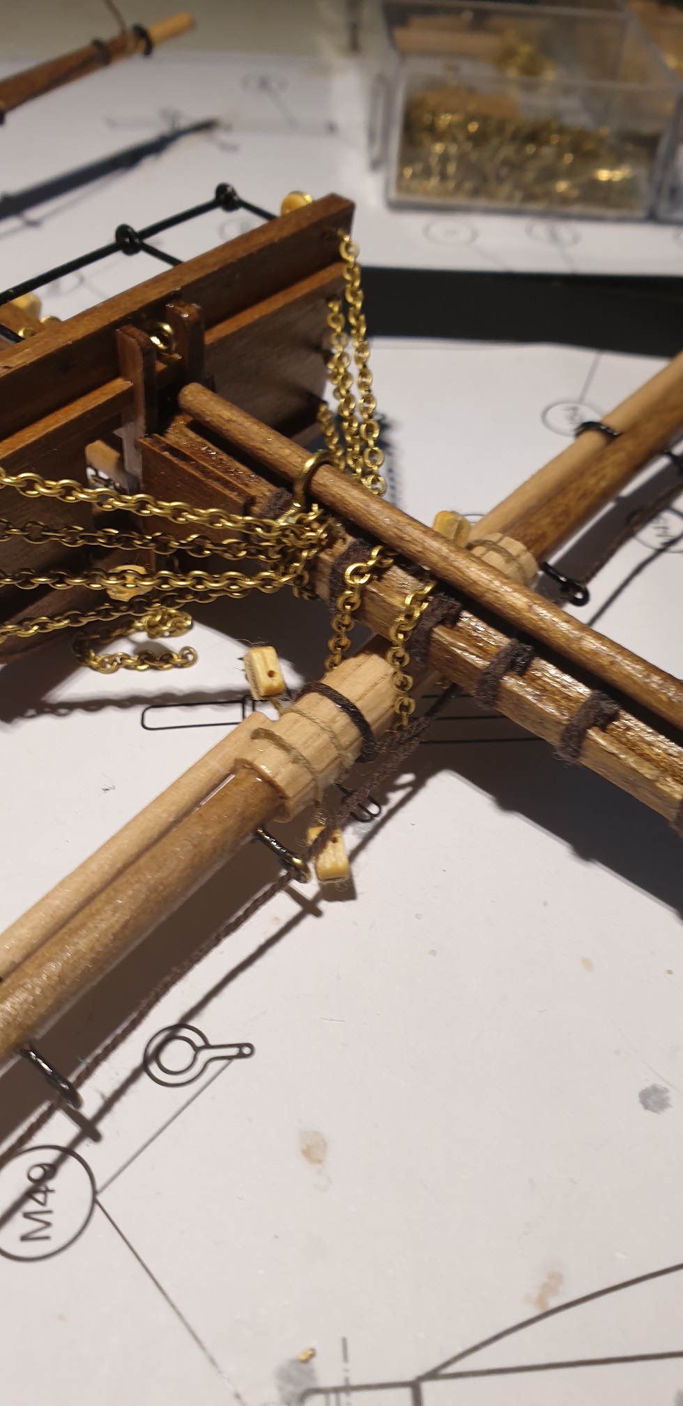 Mocowanie pierwszej głównej reji oparłem na rysunkach z książki. Chciałem się jak najbardziej zbliżyć do je mocowania wg rysunków