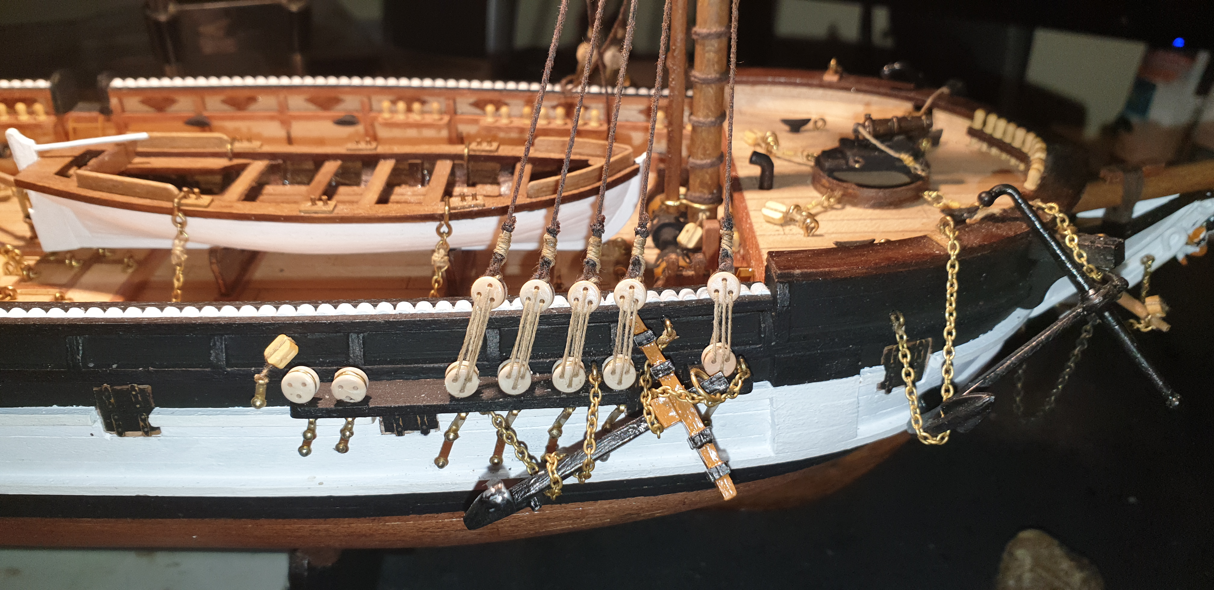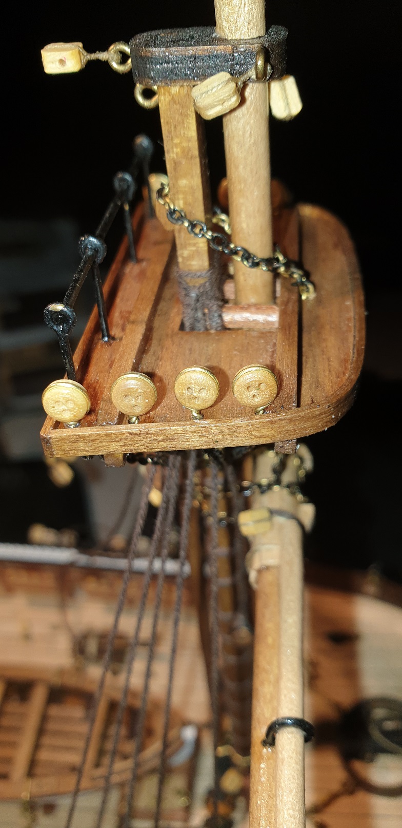 Oczywista, lepiej jest poczernic oddzielny element, jeszcze przed zamontowaniem go na modelu, bo gdy bedziesz nieuwaznie go poczernial pedzelkiem, kropelka czernidla moze wsiaknac w drewno i je brzydko odbarwic na niebiesko. Po osuszeniu metalu i koncowej kapieli w wodzie + koncowym wysuszeniu, taki element poczerniony nie odbarwi juz np. drewna.