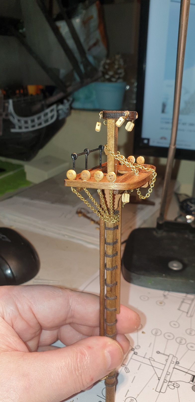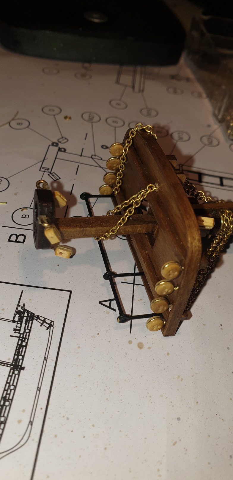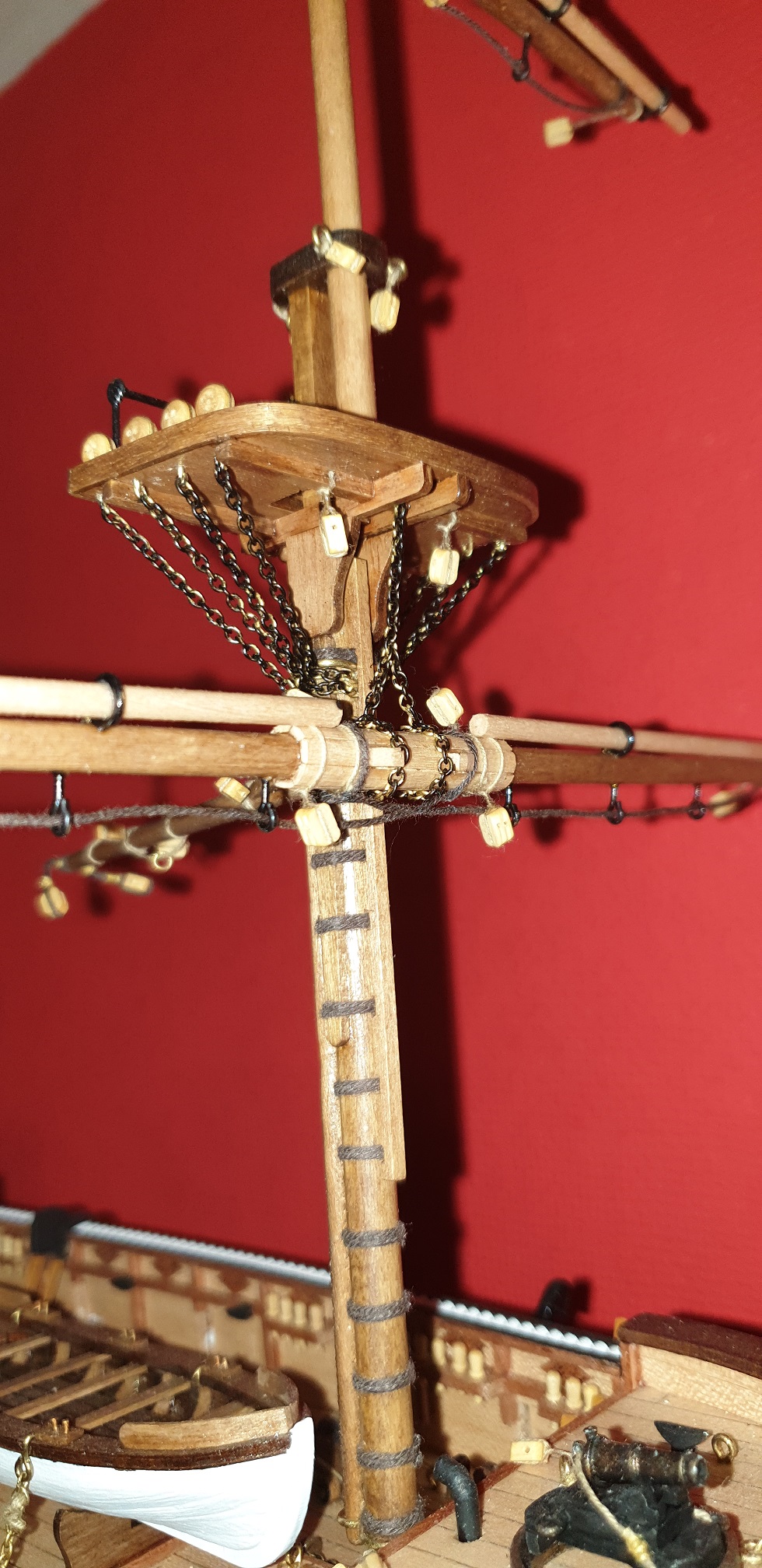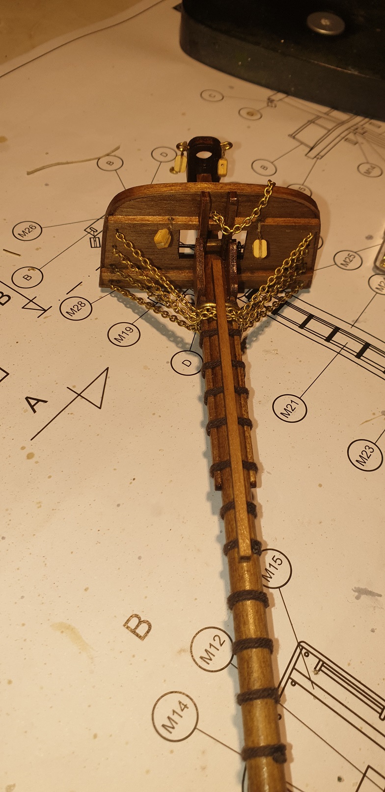 Z tym łańcuszkiem też tak myślałem ze jest jakby ciut za gruby . Wykorzystałem ten z zestawu ale i tak musiałem dokupić. Szkoda ze nie przyszło mi do głowy żeby kupić cieńszy. Na temat czernienia miałem dylemat. Teraz to jakby "rozświetla" model i jest widoczny, po zaczernieniu pewnie tak jakby zniknie. Ale myślę że masz racje myślę ze oryginalnie na okręcie pewnie był czarny. Tez dużo myślałem na temat masztów . Bo widziałem ze były tez one malowane w czarno białe barwy. Np replika ma je pomalowane na czarno a "gniazda bociana" na biało. Ostatecznie zostawiłem kolor drewna. Sam jestem ciekawy jak było oryginalnie czy dokładnie tak jak na replice ?