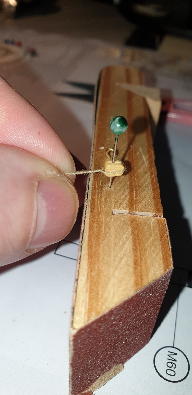 Mocuje bloczek szpilka potem oplatam go nicią i skręcam potem na okolu 1 mm od bloczka kapkę kleju który skleja skręconą nic i jednocześni ją do bloczku