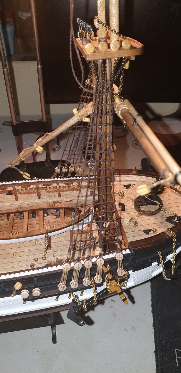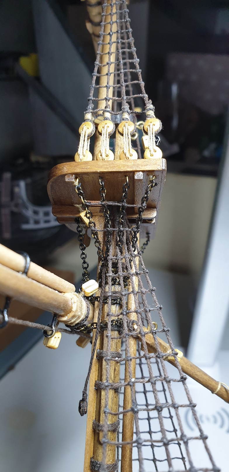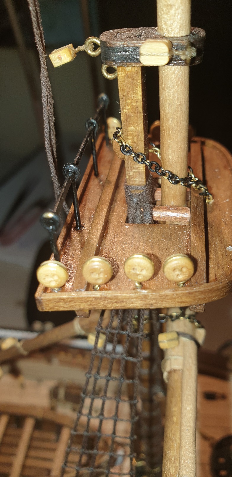 Oczywista, lepiej jest poczernic oddzielny element, jeszcze przed zamontowaniem go na modelu, bo gdy bedziesz nieuwaznie go poczernial pedzelkiem, kropelka czernidla moze wsiaknac w drewno i je brzydko odbarwic na niebiesko. Po osuszeniu metalu i koncowej kapieli w wodzie + koncowym wysuszeniu, taki element poczerniony nie odbarwi juz np. drewna.