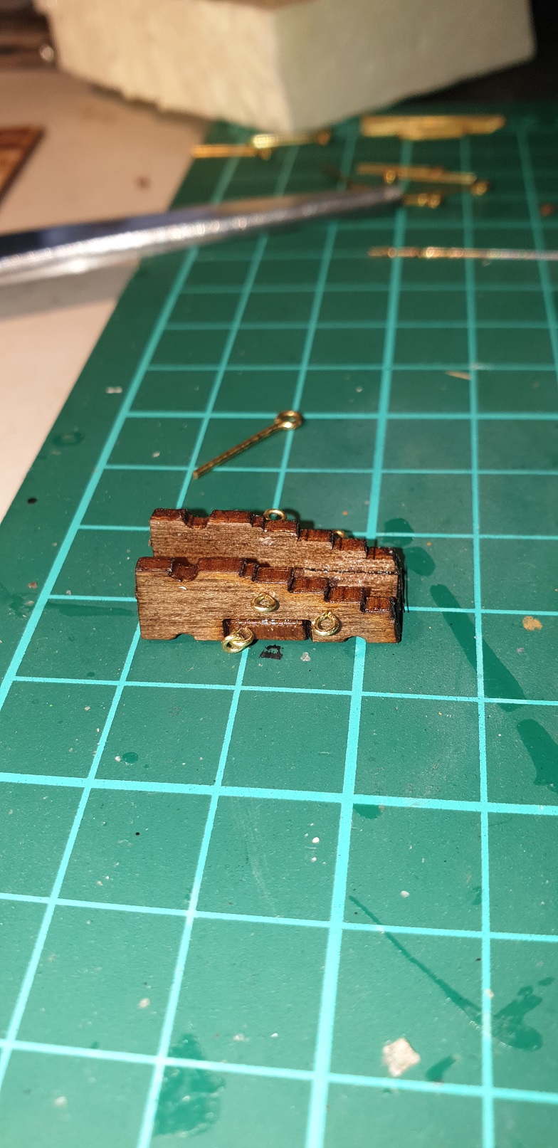 O ile wiem to oryginalnie były one na pewno drewniane oraz zrobiłem nowe oczka do lin żeby trochę dopasować skale