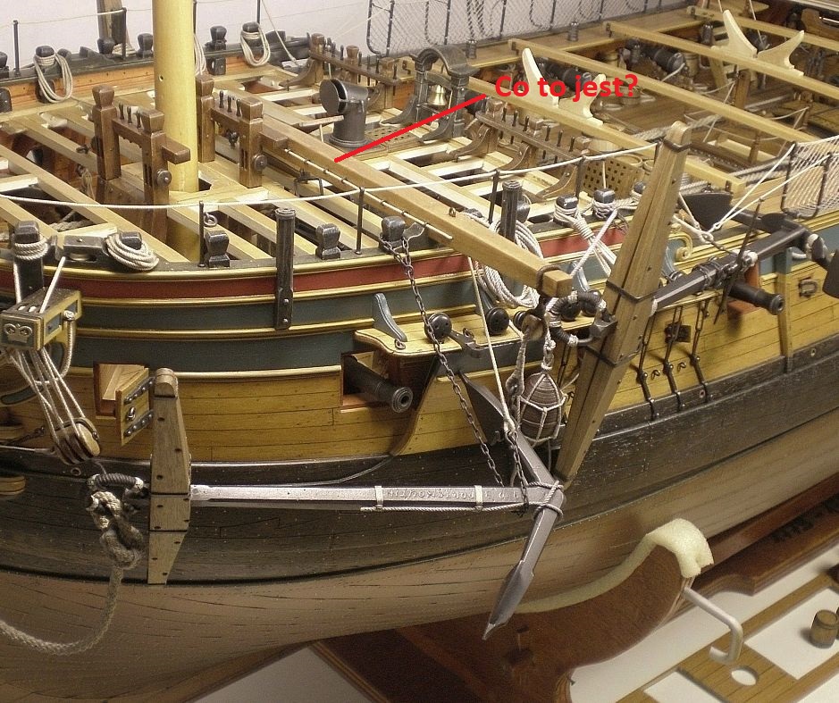 Pracując nad dokumentacją modelu fregaty angielskiej (klasa 6) natknąłem się na niektórych fotografiach modeli z tego okresu na takie "ustrojstwo" - zaznaczone na fotografii czerwoną kreską. Jest to taka solidna belka leżąca jednym końcem na pokładzie, a drugim wystająca daleko poza obrys pokładu. Na tym końcu podwieszony jest solidny blok. Lina biegnąca przez niego jednym końcem mocowana jest do knagi na pokładzie, a na drugim ma ... no właśnie co? Wydaje mi się, że drugi koniec biegnie do łapy kotwicy, a całość służy do "wyrywania" kotwicy podczas jej wybierania.