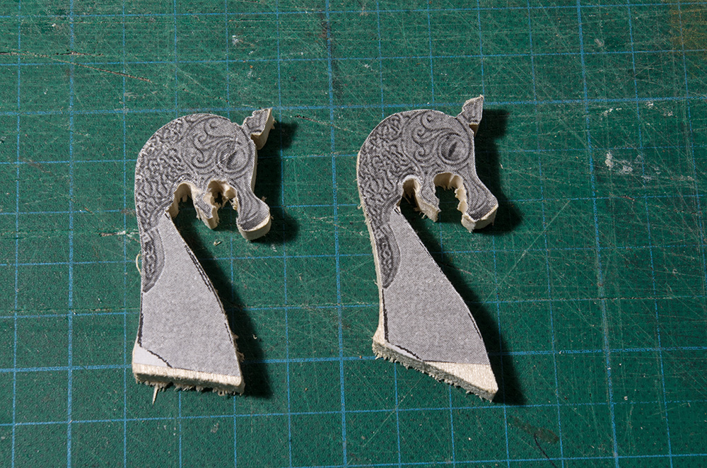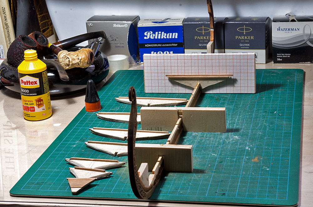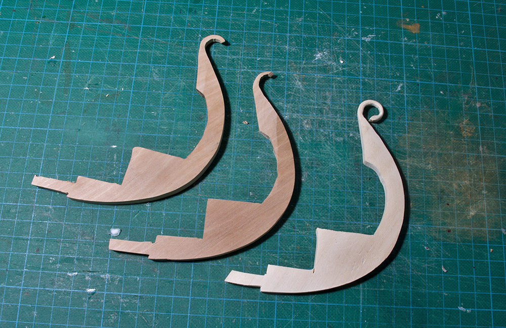 No to się zabrałem. Skany planów dostałem swego czasu od kolegi Wodzu, za co onemu serdecznie dziękuję. Pomniejszyłem do skali 1:40, zez papieru zrobiłem połówkowy model, coby sprawdzić, czy przeskalowanie jest OK (przy budowie Skuldelewa właśnie przeskalowanie nie do końca się udało, planki poszycia były za długie), no i zabrałem się za wycinanie tych fikuśnych. Elektryczną laubzegą proxxona dało się z gruszowej deseczki w miarę ładnie powycinać, ale przy dopieszczaniu małym raszpelkiem ślimakowego zakończenia stewy się ono upier…tentego. Kolejna stewa.. i to samo. No to poszukałem inne drewienko, wyglądało na mniej twarde niż grusza (nie wiem co to), no i z tego wyciąłem te fikuśne stewy. Jedna wyszła OK, druga się upier…tentego, trzecia też.