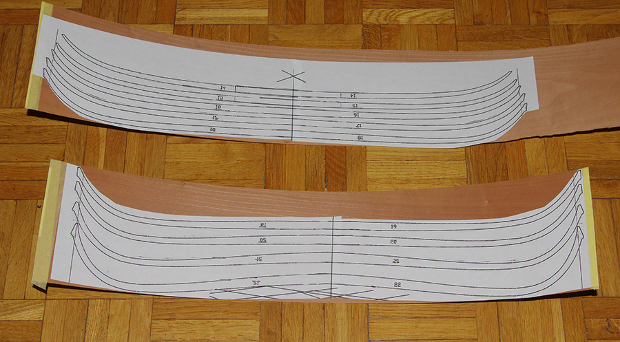 Wg planów z zestawu planki składają się z dwóch części, są dłuższe niż potrzeba, łączone na modelu. Po prostu docina się na modelu, podczas klejenia - przyklejasz jedną plankę, odcinasz na którejś wrędze blisko środka, kleisz plankę od drugiej stewy, przycinasz tak, aby się złączyły. Ja chciałem sobie ułatwić robotę, pomierzyłem, złączyłem w programie graficznym i wyciąłem od razu planki „od stewy do stewy”