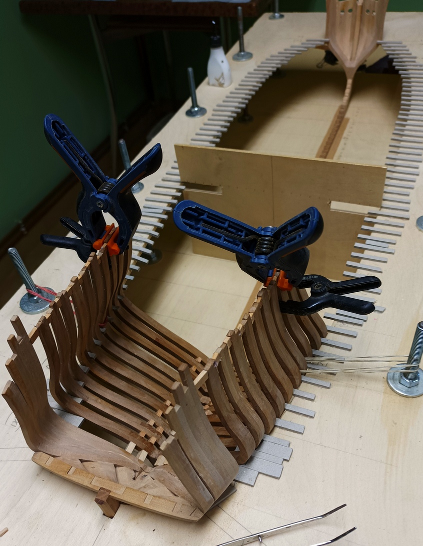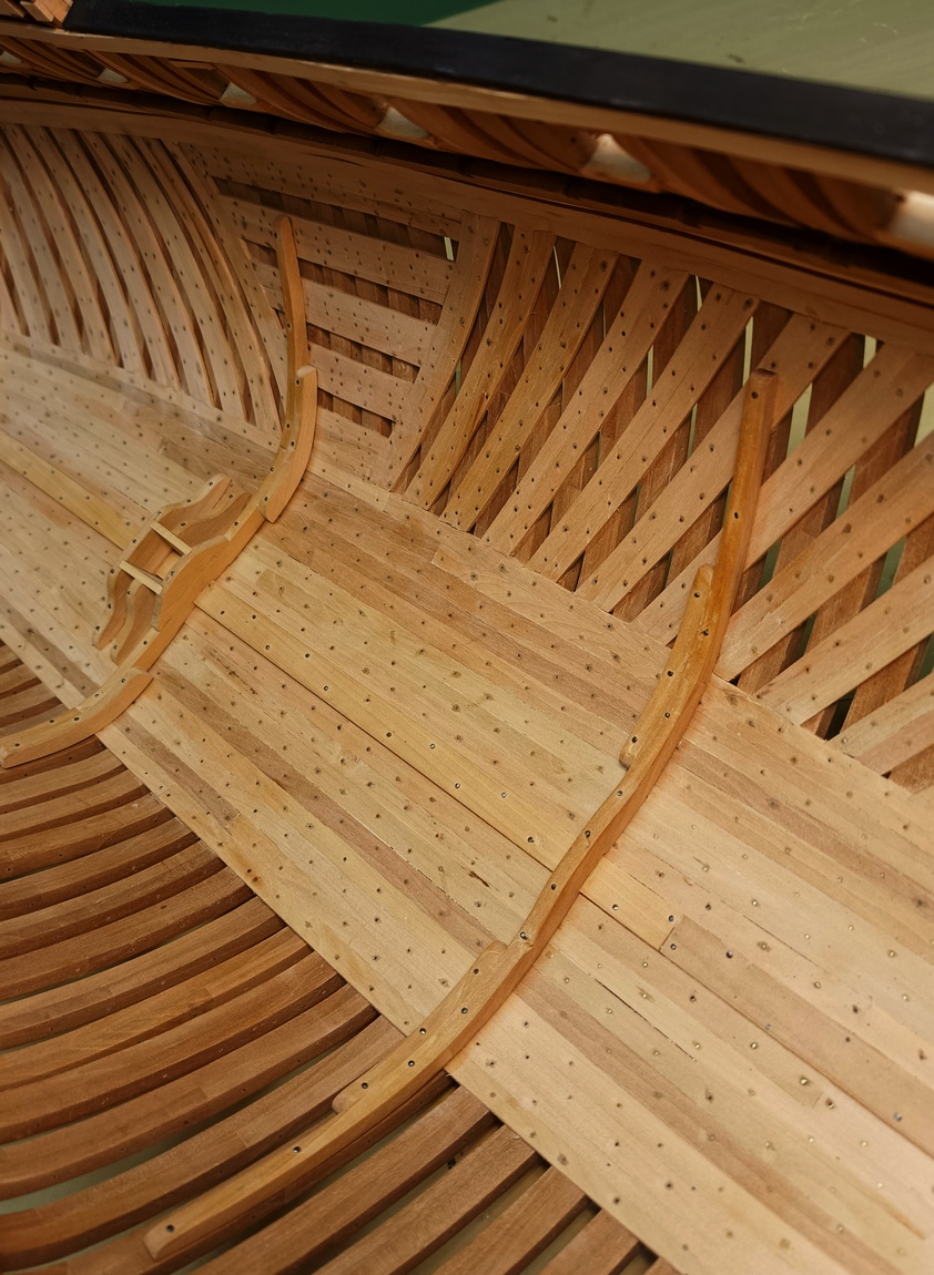 Po żmudnym kołkowaniu poszycia, przyszedł czas na wzmocnienia konstrukcji kadłuba, wraz z gniazdami masztów.