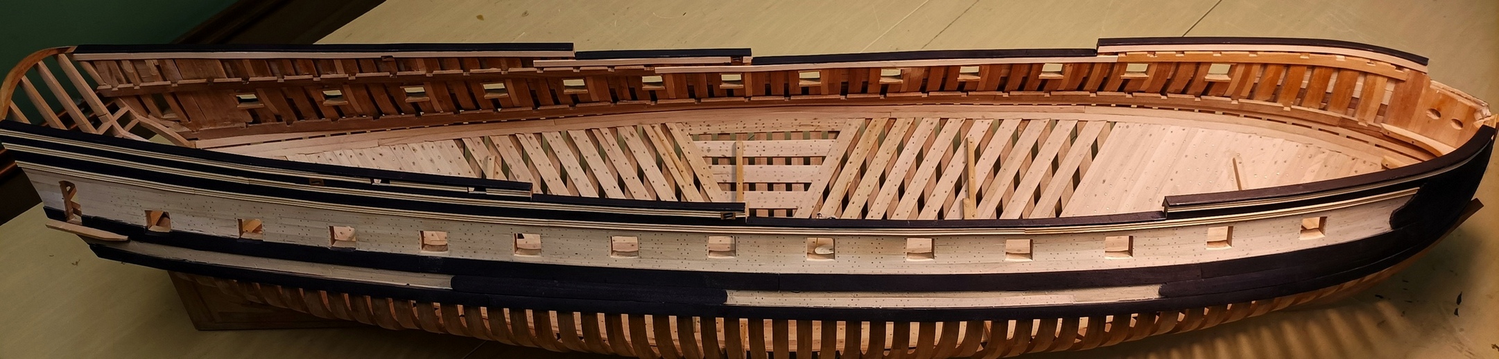 Prace nad wycięciem ambrazur zacząłem od naklejenia papierowych szablonów na szkielet.Potem żmudna walka z wycięciem i wklejeniem parapetów każdej z 26 furt. Trwało to kilka tygodni.Używałem najprostszych narzędzi. Poza piłką, ten nóż w środku był bardzo przydatny.Dalej wkleiłem poszycie wewnętrzne w części dennej i diagonalne na lewej burcie.Wbrew pozorom, wykonanie poszycia diagonalnego, nie jest trudne. W każdym razie łatwiejsze, niż klasyczne.