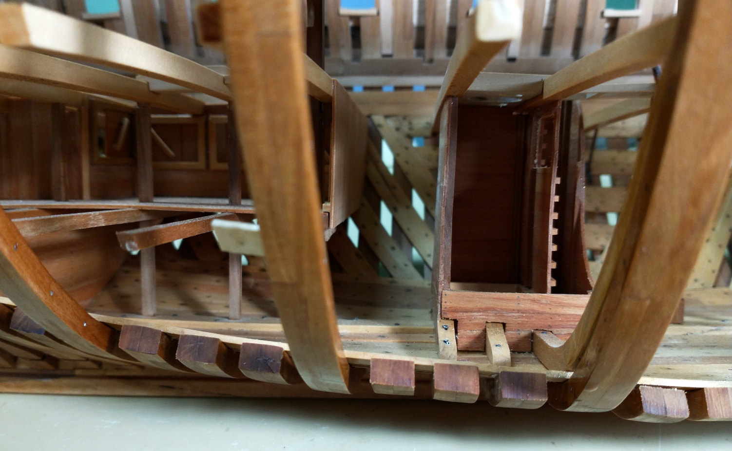 A poniżej kilkoro obiecanych ujęć wnętrza z dolnej perspektywy.Wzmocnienia pokładników wklejone. Trudne było to zadanie, lepiej było by użyć do ich montażu gwoździ lub nitów, ale z racji braku miejsca, trzeba było je ordynarnie wkleić.Można kleić powoli pokład.Tu też zamierzam użyć dwóch warstw forniru, ale tym razem brzozowego, by uzyskać jaśniejszy odcień.