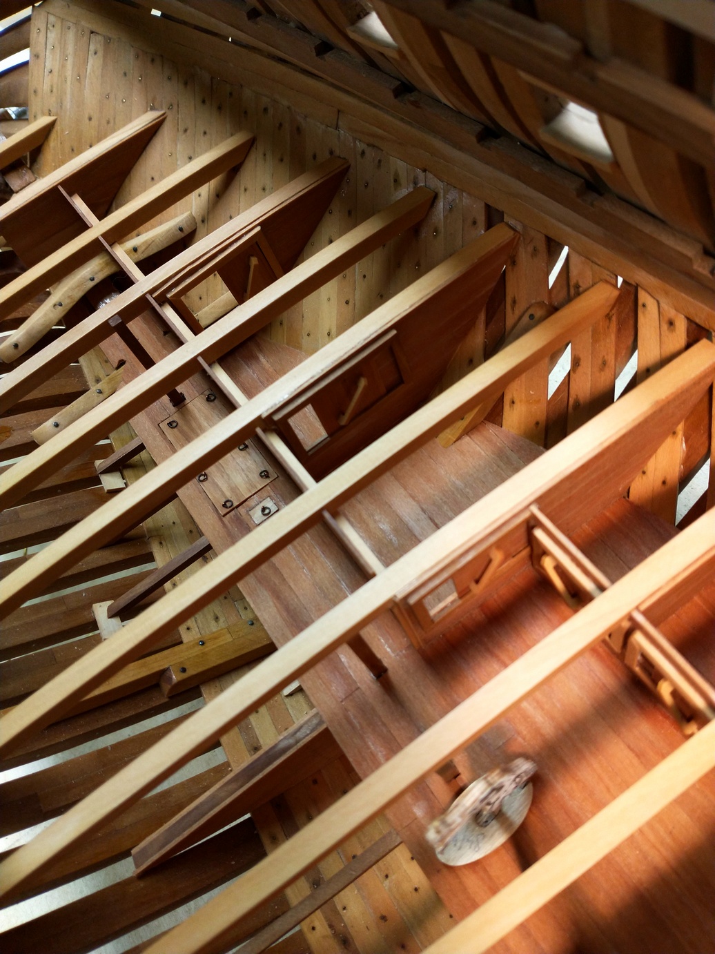 Pokłady i ścianki postanowiłem wykonać z forniru gruszy. Sklejone dwie warstwy dają jakieś 1.2 mm grubości. Jest to trochę pójście na łatwiznę, ale efekt jest dobry. Poza tym wykonanie deseczek takiej grubości jest dość trudne, a i odpad materiału byłby ogromny, około kilkaset procent. Może wpisałoby się to w "polski ład", ale dla mnie nie do przyjęcia. :)