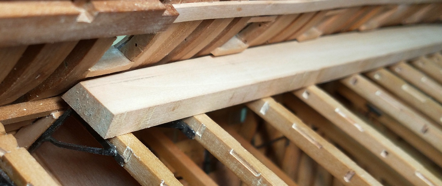 Wykonuję listwy przyburtowe pokładu głównego (waterway). Myślałem, że najtrudniej będzie zrobić odcinki na dziobie, ale dalsze części mają równie skomplikowany kształt.