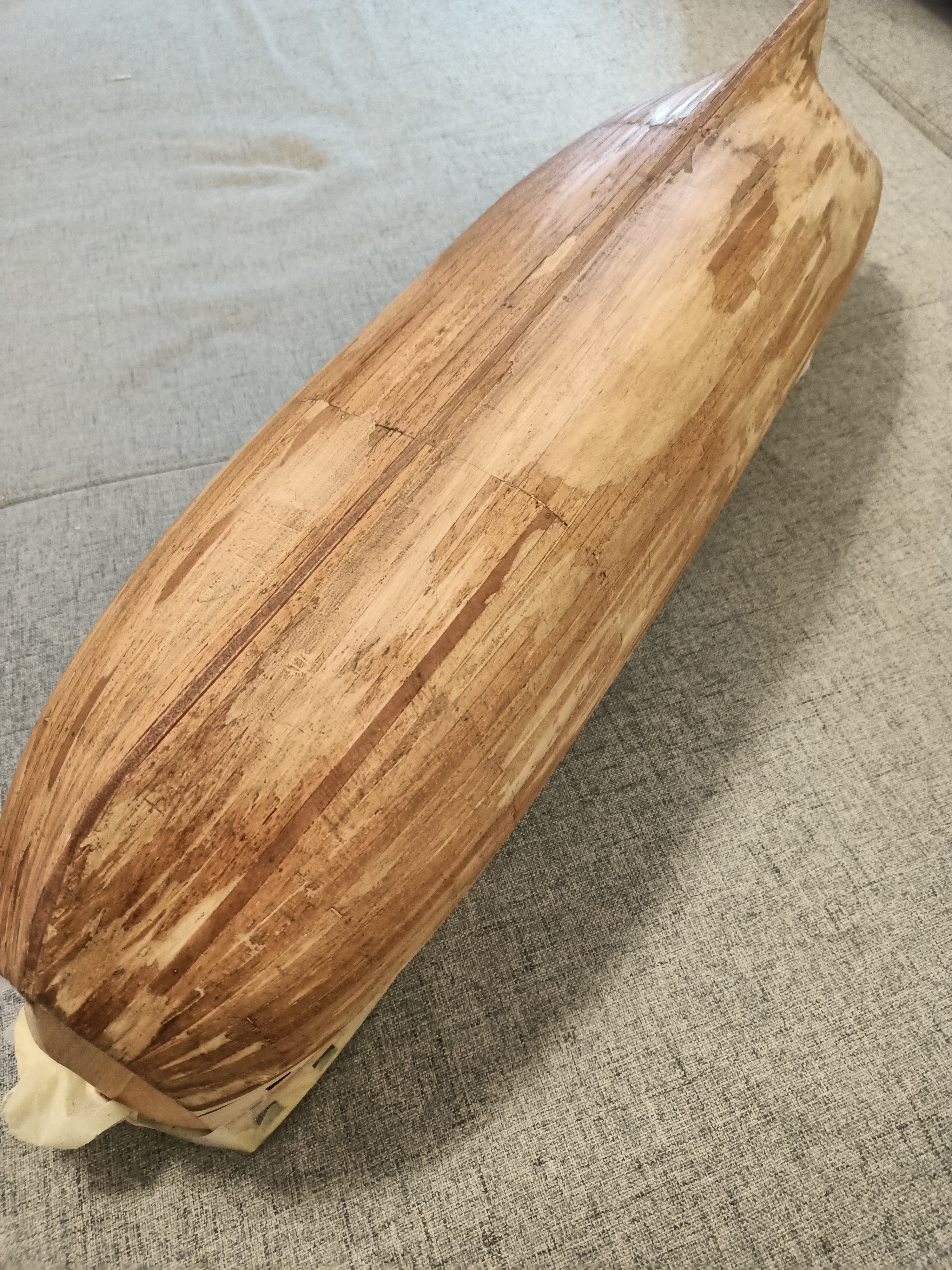 Dolna część kadłuba pierwszą warstwą listewek zakończona, dodatkowo pomalowałem jedna warstwa bejcy dół po to że jak położę drugą warstwę listewek brązowych nie prześwitywały gdzie nie gdzie jasne listewki
