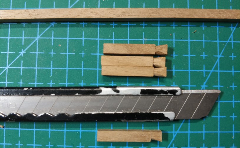 Elementy składowe kabestanu, gretingów i schodków zawarte były w zestawie. Pozostało wycięcie pachołków do barierek i nagelbanku. Listwa 3x3 mm została najpierw nacięta po obwodzie, a następnie odcięta po uprzednim usunięciu kołka dystansowego z wzornika. A dalej nożyk ...