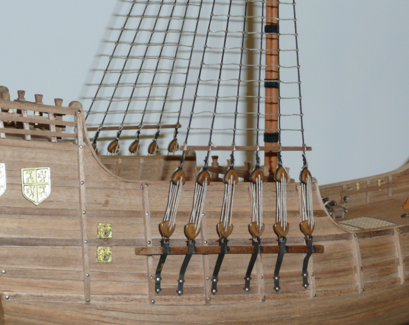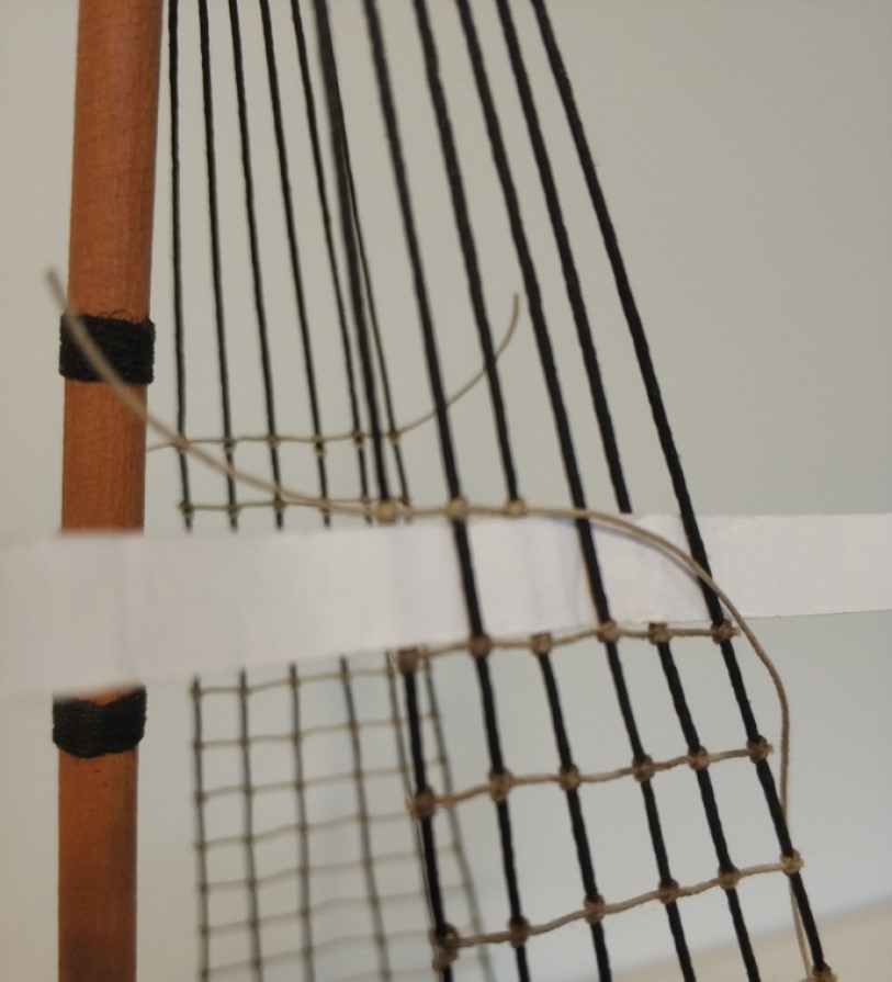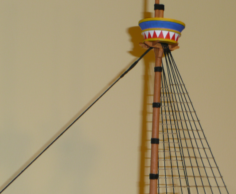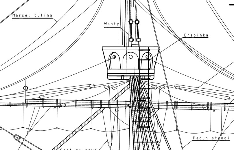 Olinowanie stałe grotstengi w planach Amati (dwie wanty do kosza z każdej burty) wydaje mi się mocno uproszczone. Każdy silniejszy podmuch wiatru od dziobu, przy rozwiniętym marslu, grozi złamaniem stengi. W planach z "Modelarstwa Okrętowego" występuje sztag marslowy (do fokmasztu) oraz para padunów. Sztag dodałem, a co do padunów jeszcze się zastanawiam (nie bardzo widzę gdzie je na pokładzie zamocować, a może na zewnątrz na burcie). Można też rozważyć achtersztag, ale nie wiem czy w tym okresie był stosowany.