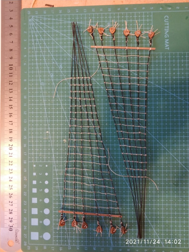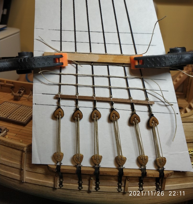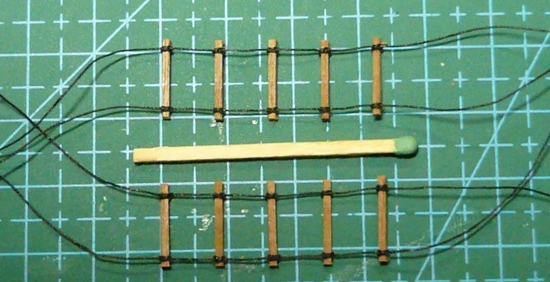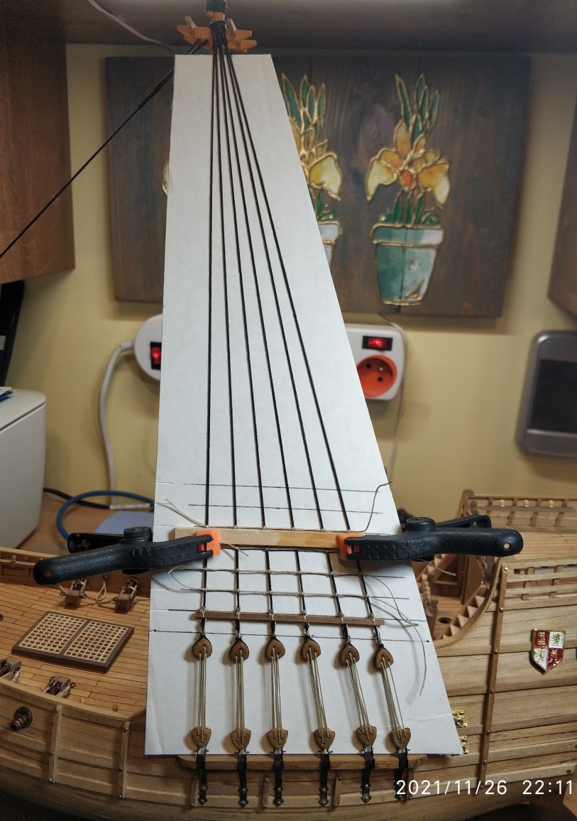 Podobna sprawa z wiazaniami talrepow do jufersow. Albo metalowy (z drutu) wzornik/odstepnik, ktory wsuwasz w dziurki od obu jufersow i wg. niego ustalasz wstepnie dlugosc kazdej z want przywiazujac jej dolny koniec do gornego jufersa, potem usuwasz ten odstepnik i okrecasz oba jufersy ich talrepami z linek. Albo tez zrob, jak ja to zrobiem dla mego Francuza (zerknij w moja relacje tutaj https://www.koga.net.pl/forum/523/46424.html?start=60 ) - kawalek cieniutkiej sklejki z nawierconymi dziurkami dla jufersow ktore sa tam tymczasowo przyczepione, wsunietej za dolne jufersy i wg. niej nastepuje dalsze ich montowanie do want, jeden po drugim.