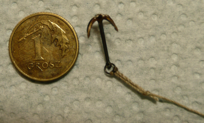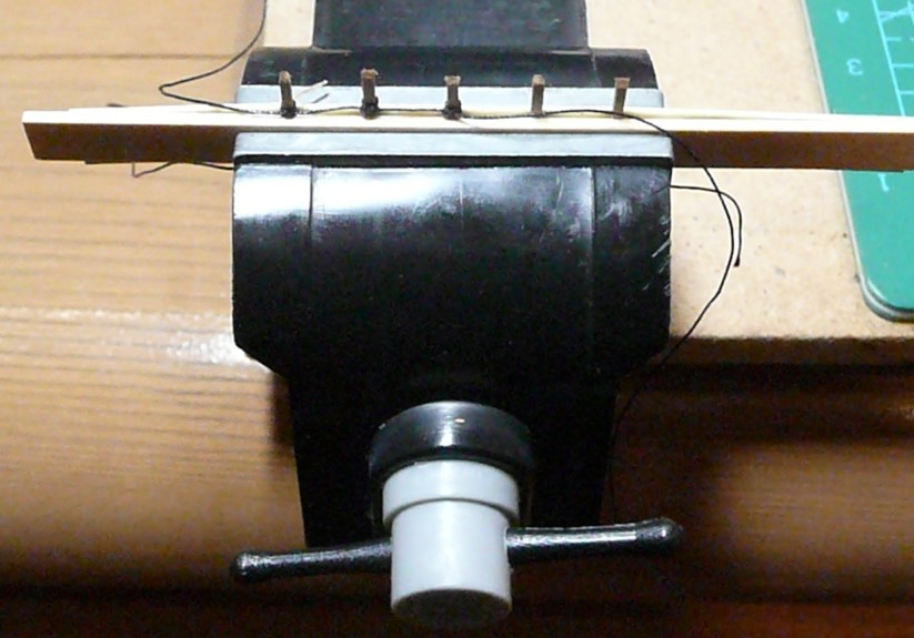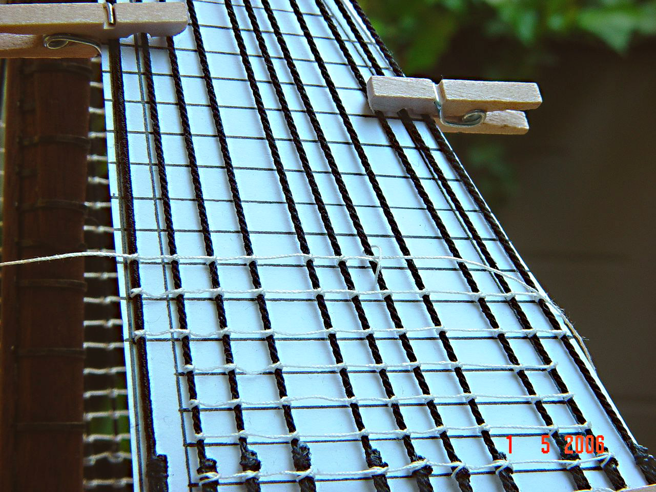 Zrob sobie taki szablonik z papieru, trojkat z zaznaczeniem olowkiem want i wyblinek, i wsun to za Twe wanty i tymczasowo przypnij go do want np. malymi szczypczykami z drewna czy mini aligatorkami metalowymi - patrz zalaczniki. Bedziesz mial wzor do wiazania wyblinek, ktore wtedy beda wszystkie biegly rowno. Uzyj ten sam szablonik dla drugiej burty, by uzyskac tam sytuacje identyczna ale symetryczna (lustrzane odbicie).