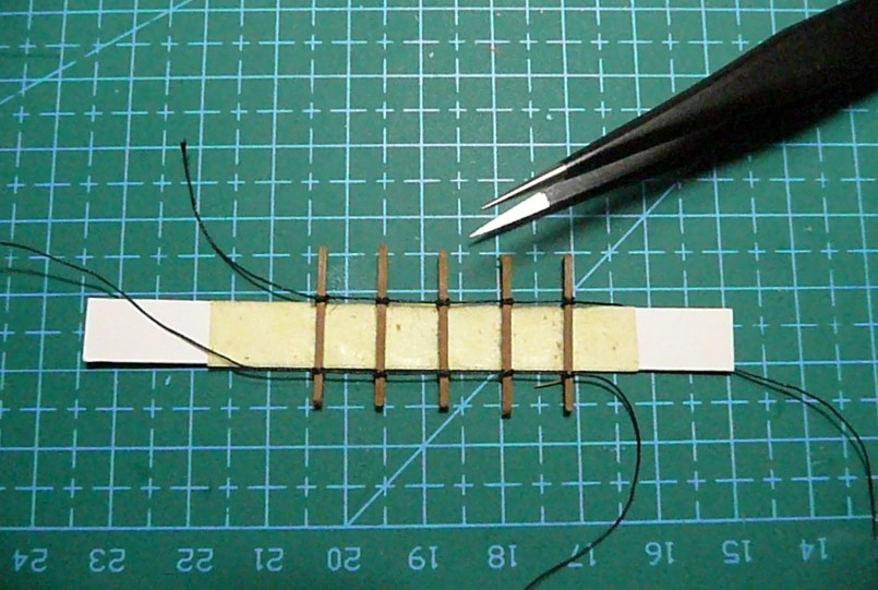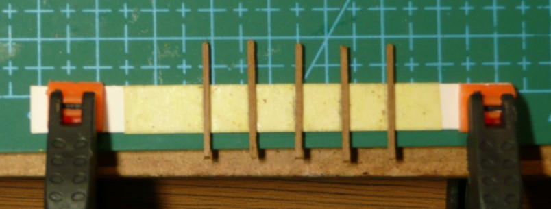 - na pasek kartonu nakleiłem taśmę samoprzylepną, stroną przylepną na górze. Do niej przylepiłem szczebelki drabinki. Szerokość paska i rozstaw szczebelków to 8 mm, co po przeskalowaniu daje akceptowalne 52 cm.