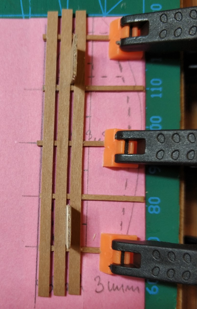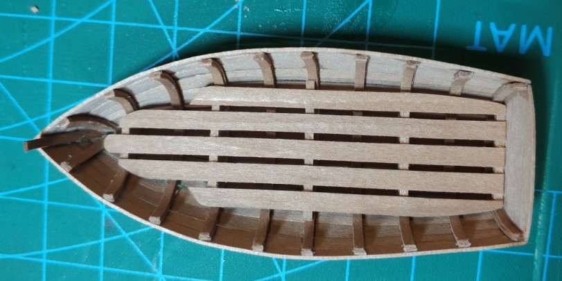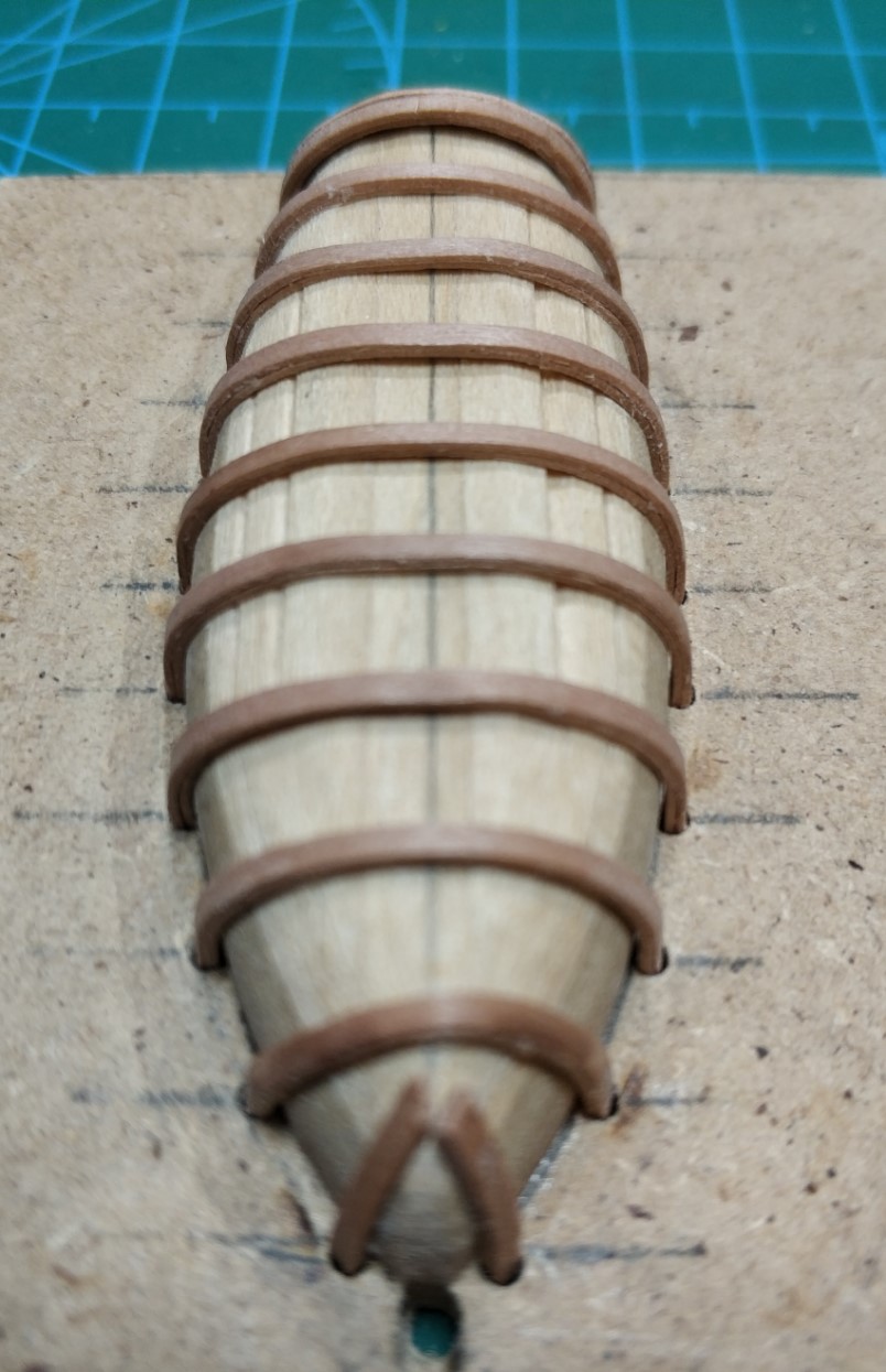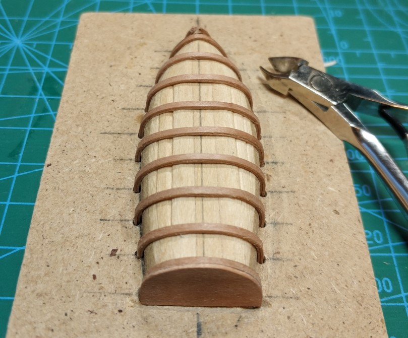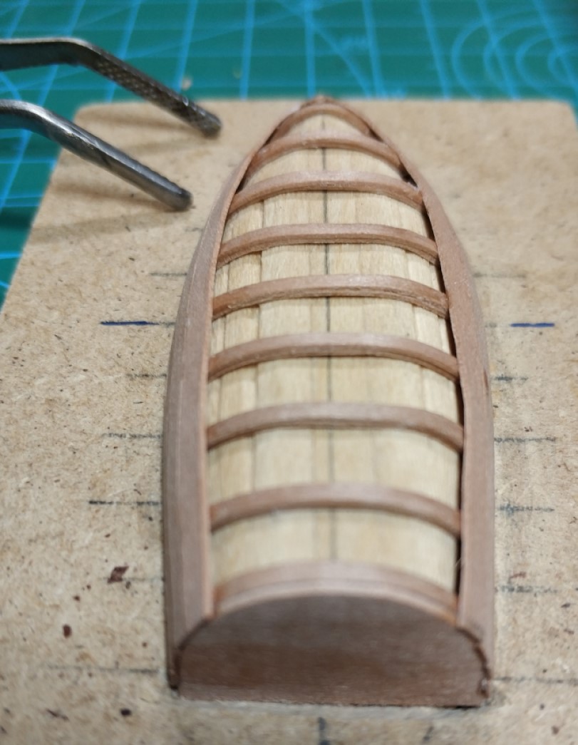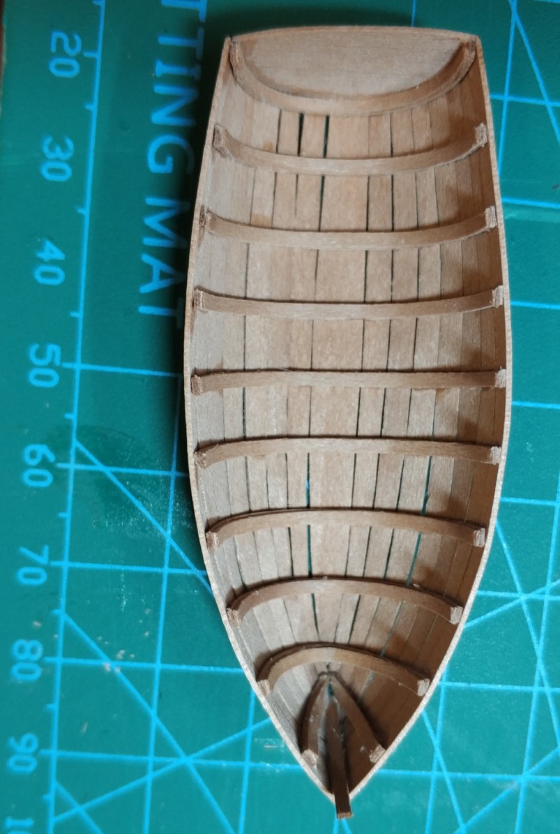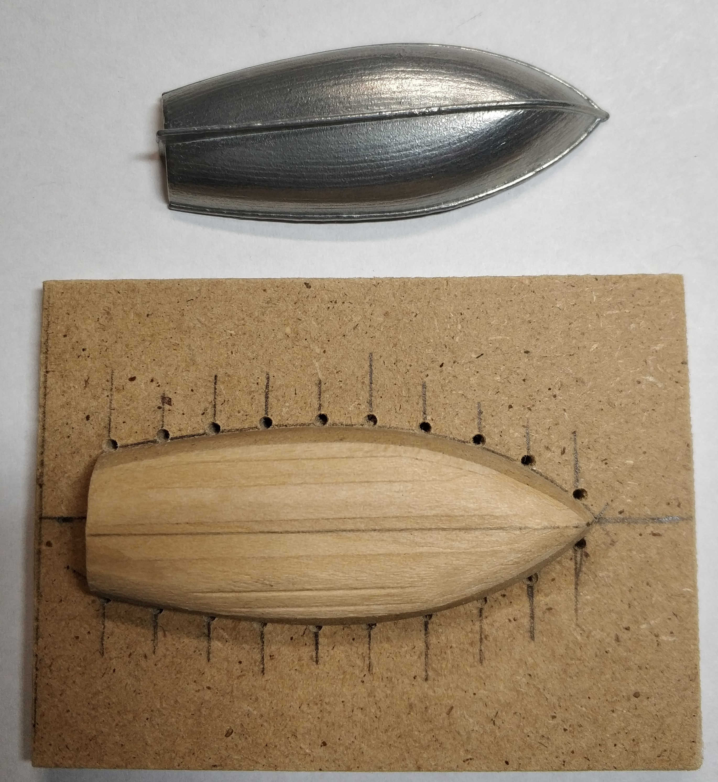 Łódź zostanie wykonana z forniru gruszy o grubości 0,6 mm. Nawiercone otwory dookoła kopyta, posłużyły do ustawienia wręg. Każda wręga sklejona jest z dwóch pasków o szerokości 1,5 mm. Rozstaw wręg - 7 mm.