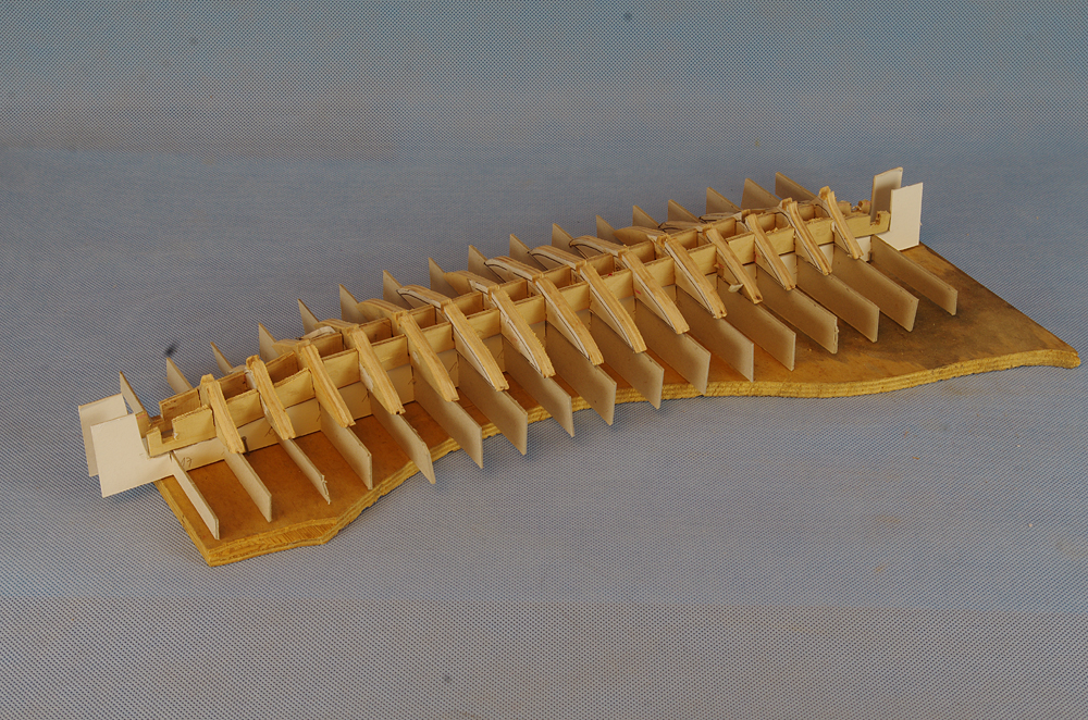Kolej na wręgi. Tu też musiałem trochę pokombinować. Pokład nie jest płaski, ale zmienny, na końcach w miarę płaski, ale zasadniczo to wklęsły z garbem przy maszcie. Profil pokładu w planach Bilings Boat różni się troszkę od profilu wykreślonego na podstawie wraku. Pokombinowałem więc trochę, aby był jak najbardziej zbliżony do planów wg wraku. Trochę zastanawiałem się, jak zrobić, aby wklęśnięcie pokładu przebiegało „gładko”, bez „schodków”. W modelu ćwiczebnym, gdzie niby wszystkie wręgi wycinane były wg planów BB jednak zdarzyło się niewielkie załamanie pokładu. Tu wystarczy, że któraś wręga będzie o milimetr wystawać ponad inne, lub o milimetr niżej i już powstaje problem, który trudno zniwelować np. przez przyłożenie linijki… bo pokład idzie minimalnie po łuku. Aby więc uniknąć tego błędu wymyśliłem taki stelaż-szablon z twardej tektury z wklejonymi poprzeczkami w miejscu wręg, przy czym każda poprzeczka odpowiada odwrotności wysokości odpowiadającej jej wrędze. Dodatkowo zastosowałem dwa wzdłużniki wycięte po łuku odpowiadającym profilowi pokładu. Wręgi sklejałem z tymi wzdłużnikami na kartonowym szablonie, który nie tylko utrzymywał odpowiednią wysokość wklejenia wręg, ale też ich odpowiednie ustawienie prostopadle do osi. Dopiero tak sklejony szkielet w całości wkleiłem w stępkę, mając pewność, że któraś wręga nie „wpadnie” mi niżej lub „wyskoczy” wyżej.