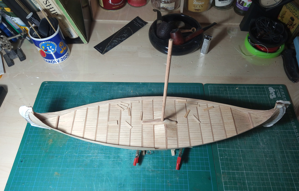 Trochę zaniedbałem relację, czas nadgonić. Poszycie kadłuba gotowe, czas położyć pokład. Tutaj taka ciekawostka, przy bloku masztowym pokład się wznosi, tworzy się taki wał a środku pokładu.