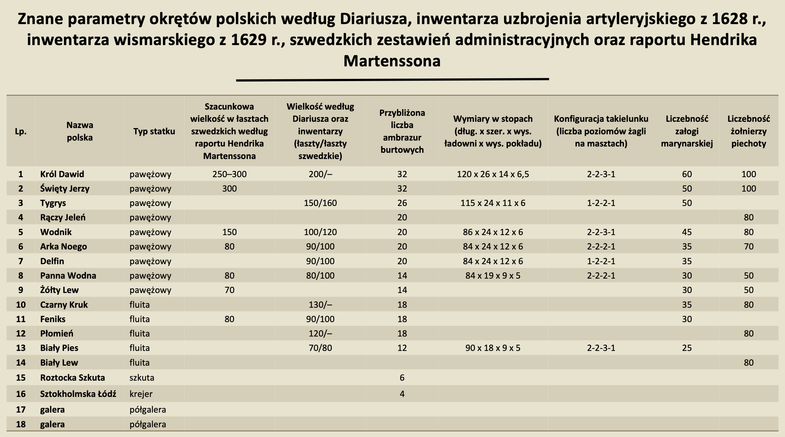 "Biorąc pod uwagę ich możliwości, tzn. wielkość i liczbę ambrazur, niemal wszystkie okręty polskie były dość poważnie niedozbrojone artyleryjsko, i to przez cały okres istnienia floty. Jeśli chodzi o działa lawetowe (czyli pomijając działka relingowe), to sumarycznie okręty floty były uzbrojone zaledwie na 2/3 swoich możliwości, zarówno według inwentarza z 1628 r., jak i tego z 1629 r. (Czarny Kruk występuje tylko w tym pierwszym, ponieważ zatonął w drodze do Wismaru zimą 1628/29). Oczywiście różne jednostki w różnym w różnym stopniu, a w najgorszym dla nowo wcielonych, zarekwirowanych fluit, które nie miały dział w ogóle.