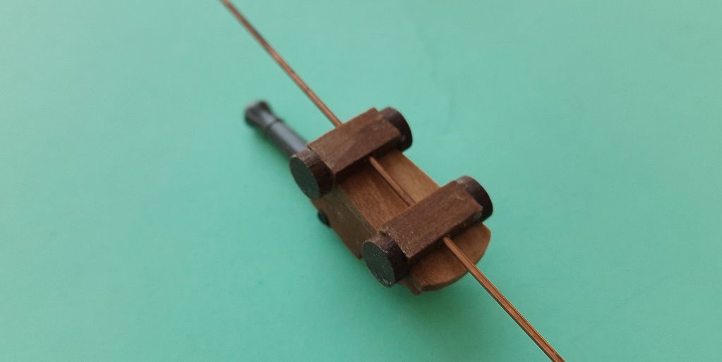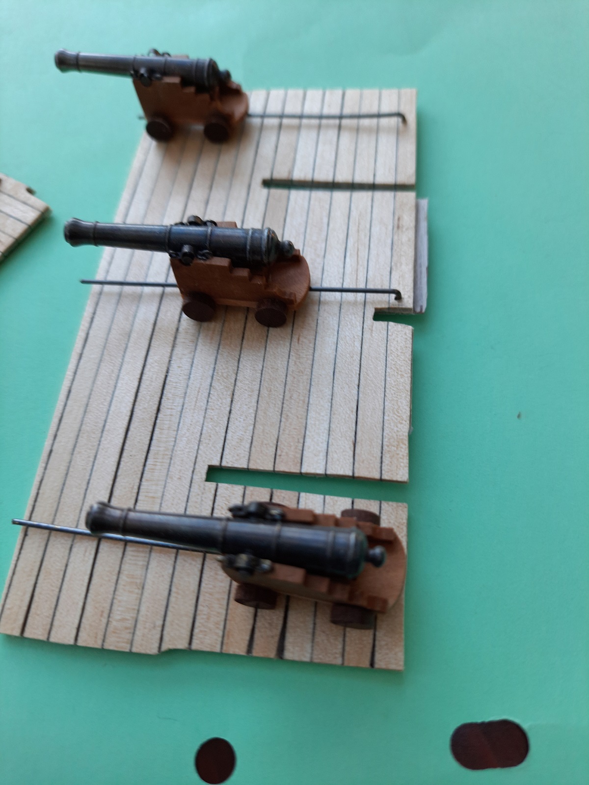 Armaty przeważnie montowane są na modelu kiedy kadłub jest poszyty a na pokładzie stoi większość elementów wyposażenia. Nie będzie tak jednak w moim modelu. Poszły na pierwszy ogień bo trzeba je schować na dolnym pokładzie. Aby nie przeszkadzały w trakcie budowy wykombinowałem że będą zamontowane i chowane na prowadnicy. Wyciągnięte będą dopiero po wykonaniu poszycia i położeniu pokładu górnego. Myślę że prowadnice których w rzeczywistości nie było nie będą widoczne bo światło dostaje się pod pokład w ograniczonej ilości jedynie przez otwory armatnie. jak to realizuję można zobaczyć na załączonych zdjęciach. Janek.