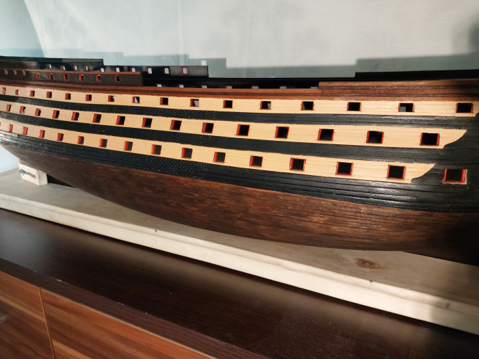 Mysle, ze szpachlowanie kadluba i malowanie go jest dobrym wyjsciem w Twej konkretnej sytuacji. Poszycie listewkowe na Twym modelu jest niestety dalekie od perfekcyjnego, zwlaszcza ta duza szpara w prawej burcie w okolicy dziobowej (przedostatnia fotka) i nieprawidlowo polozone, sztukowane poszycie przy rufie (ostatnie zdjecie).