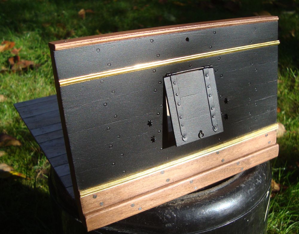 jest armata to i będzie stanowisko artyleryjskie .Zdecydowałem się na wycinek z Royal Katherine której model wykonałem .Stanowisko będzie w skali 1:15 .Na razie wykonałem wycinek pokładu .Teraz pracuję nad rzeźbami i wyposażeniem .Nigdzie nie natrafiłem na informację gdzie składowano osprzęt ,wyciory szufle itd Czy wisiały nad otworem armatnim na specjalnych uchwytach czy znajdowały się w pomieszczeniach pod pokładem .Może ktoś natrafił na taką informację .Pozdr.R