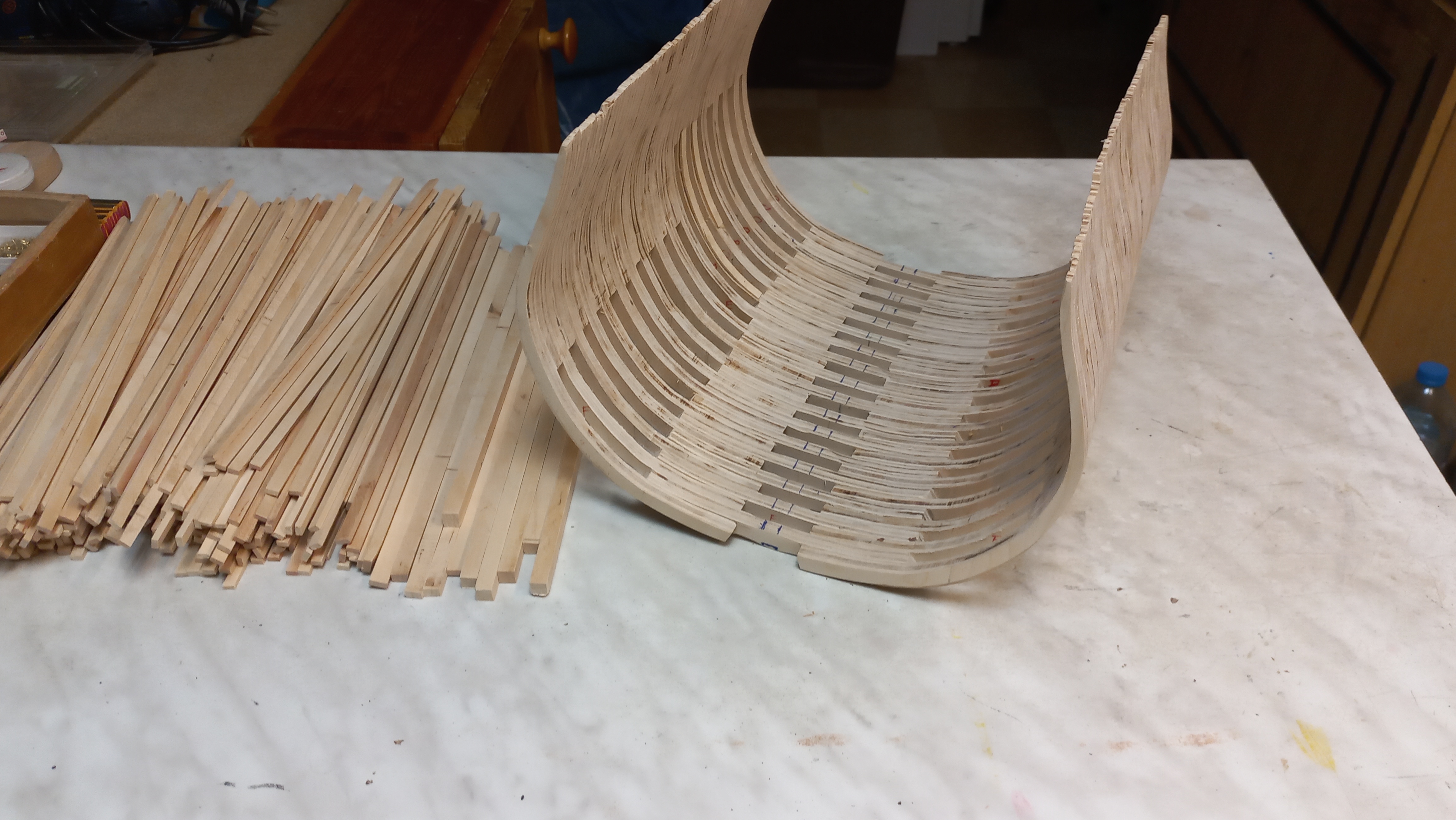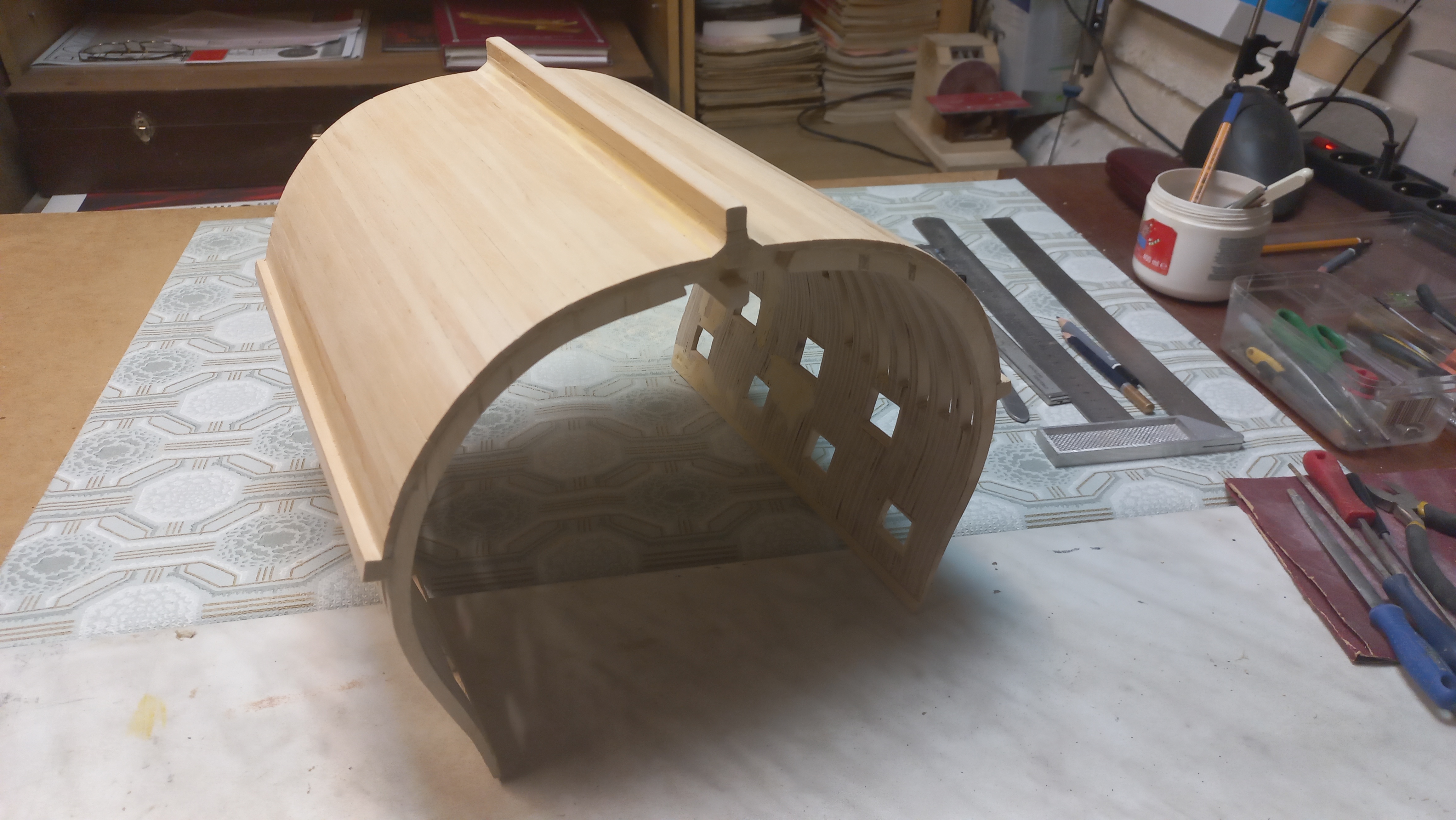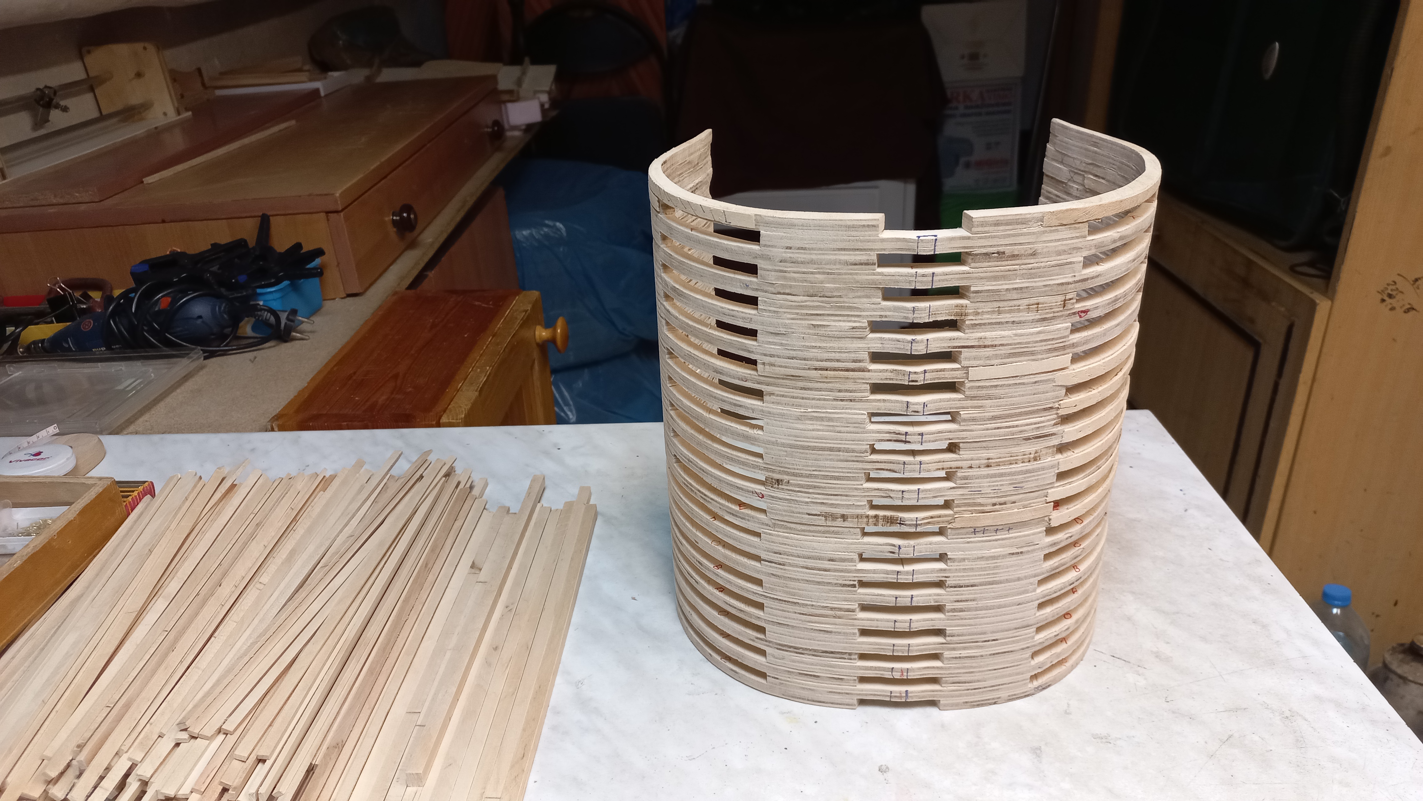 Podczas budowy Suska zostały mi nietrafione wręgi śródokręcia.Postanowiłem je zagospodarować i pobawić się z sekcją.Po niezbędnych poprawkach wyszedł materiał wyjściowy do budowy.Jak wyjdzie i co wyjdzie zobaczymy.Nie kieruję się konkretnym planem a przykładami z innych podobnych budów.Narazie kończę skorupę.A wnętrze to będzie czysta fantazja. ;)