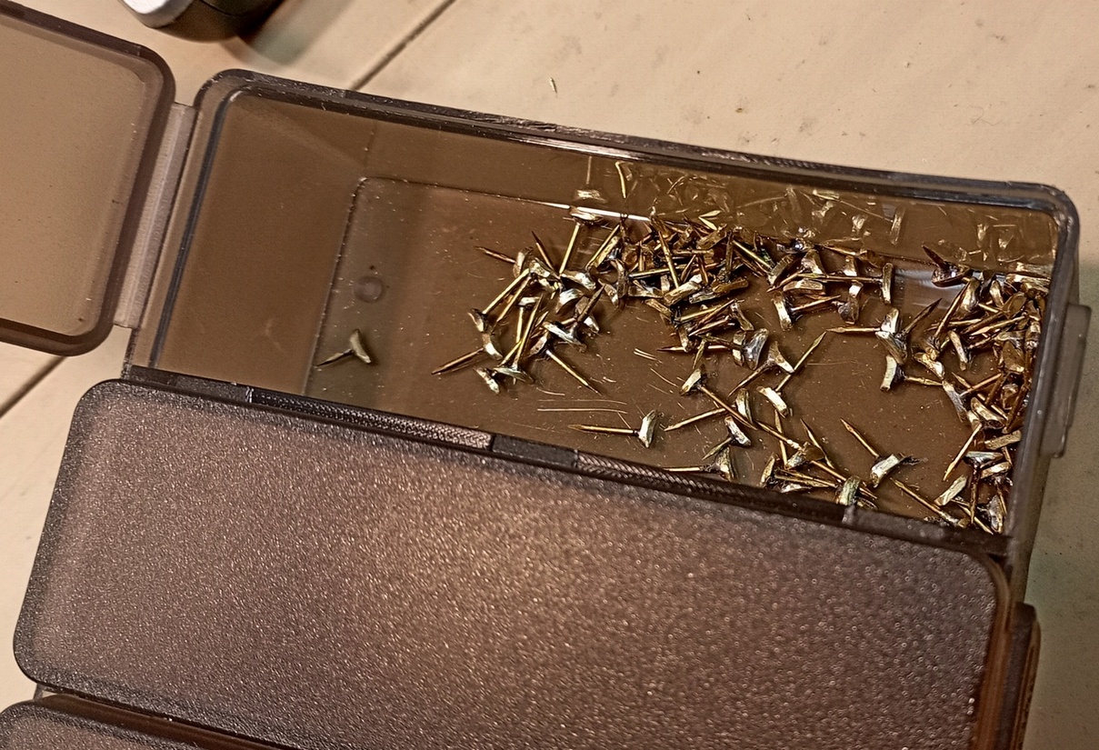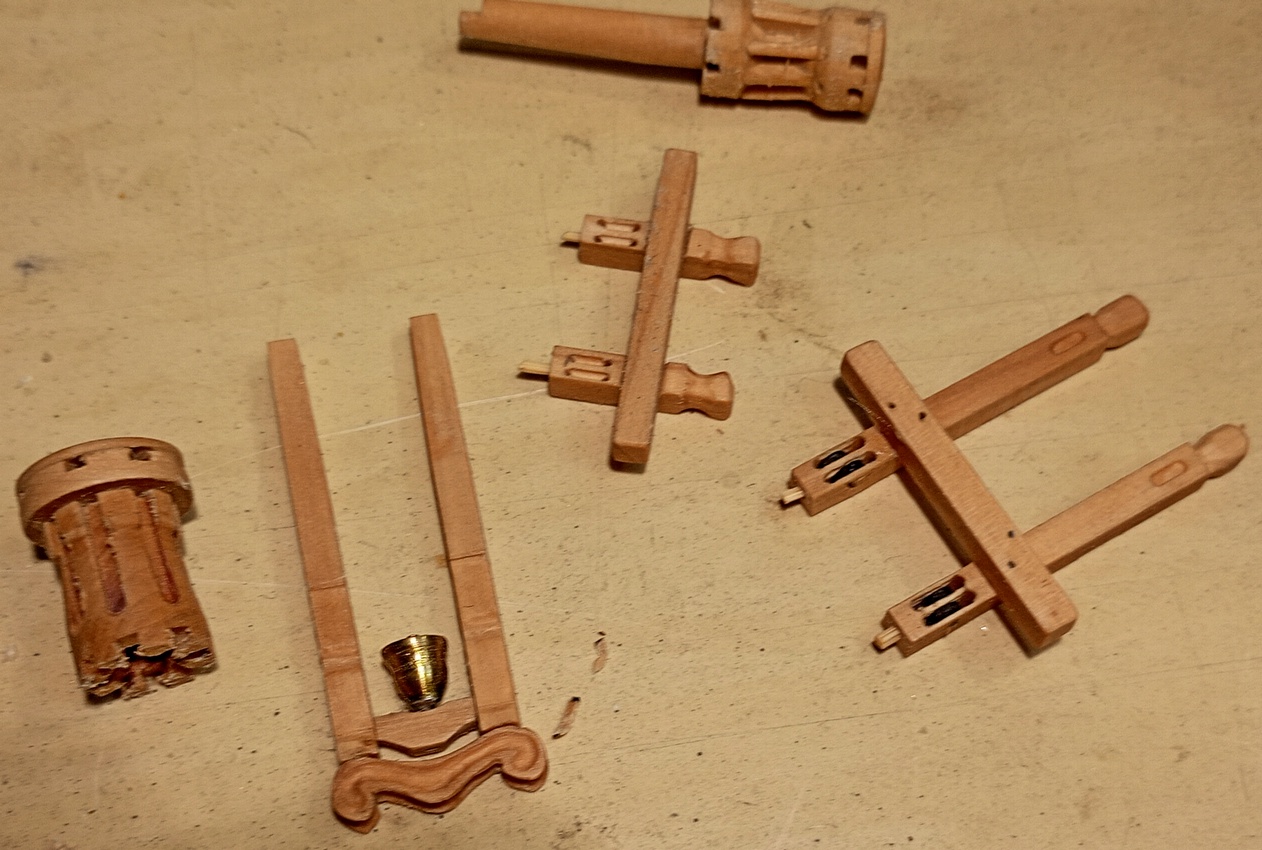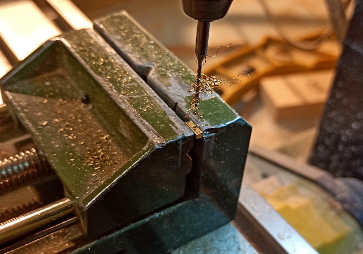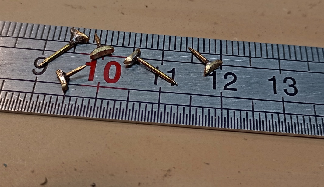 Długo przymierzałem się do wykonania knag. Po kilku nieudanych próbach z drewnem, doszedłem do wniosku, że w tej skali, na wykonanie około setki knag, mosiądz będzie lepszym rozwiązaniem. Pocięte na długość 4mm paski o przekroju 1,5 x 1,5mm, przewierciłem.