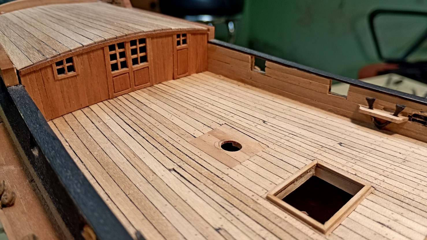 Pokładniki górnego pokładu wklejone. Początkowo planowałem wykonać nie pełne deskowanie górngo pokładu, tak by detale poniżej były lepiej widoczne, ale ostatecznie uznałem, że byłoby to niespójne z ogólną koncepcją zbudowania kopletnego modelu.