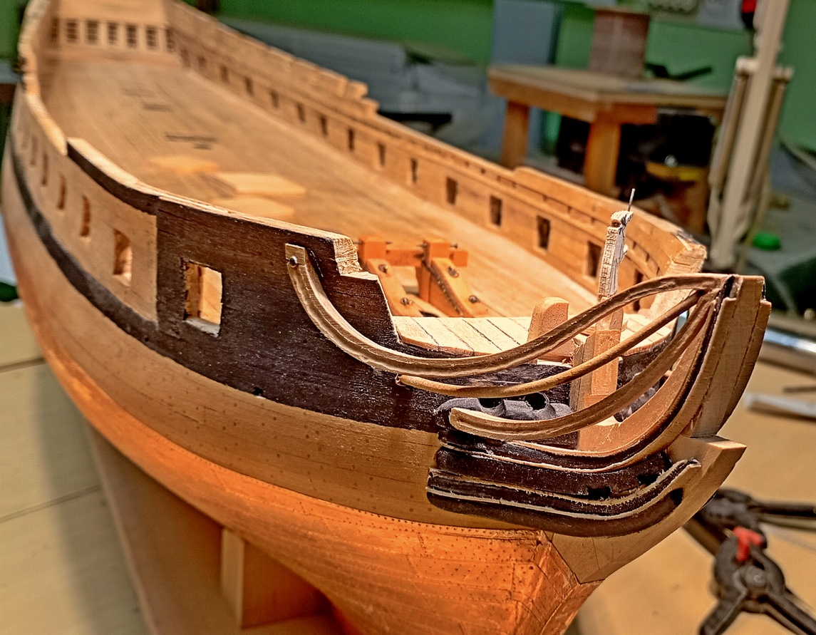 To chyba najtrudniejsza część modelarstwa szkutniczego. W tym przypadku, kluczowe znaczenie ma właściwe zaplanowanie kolejności prac. Dlatego musiałem już teraz wykonać pachoł kotwiczny i kotbelki, aby móc odpowiednio ukształtować przednią część nadburci.To tak naprawdę dopiero początek budowy kosza dziobowego, dalej będzie tylko trudniej.