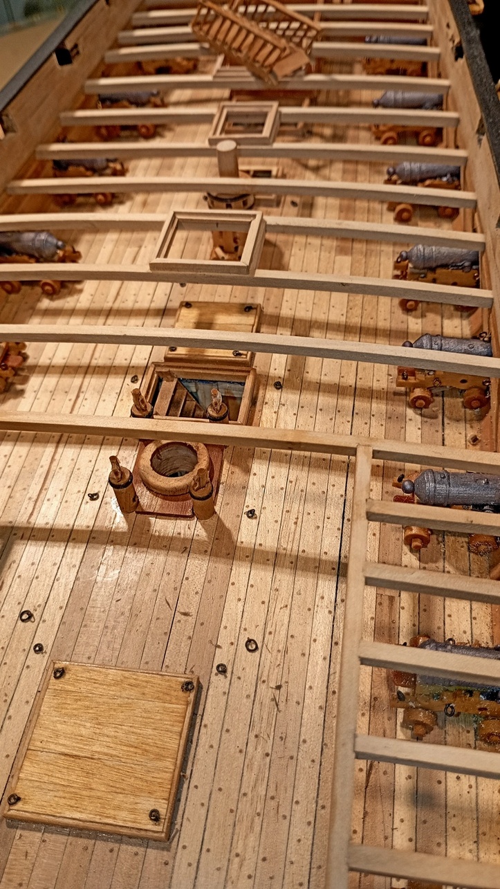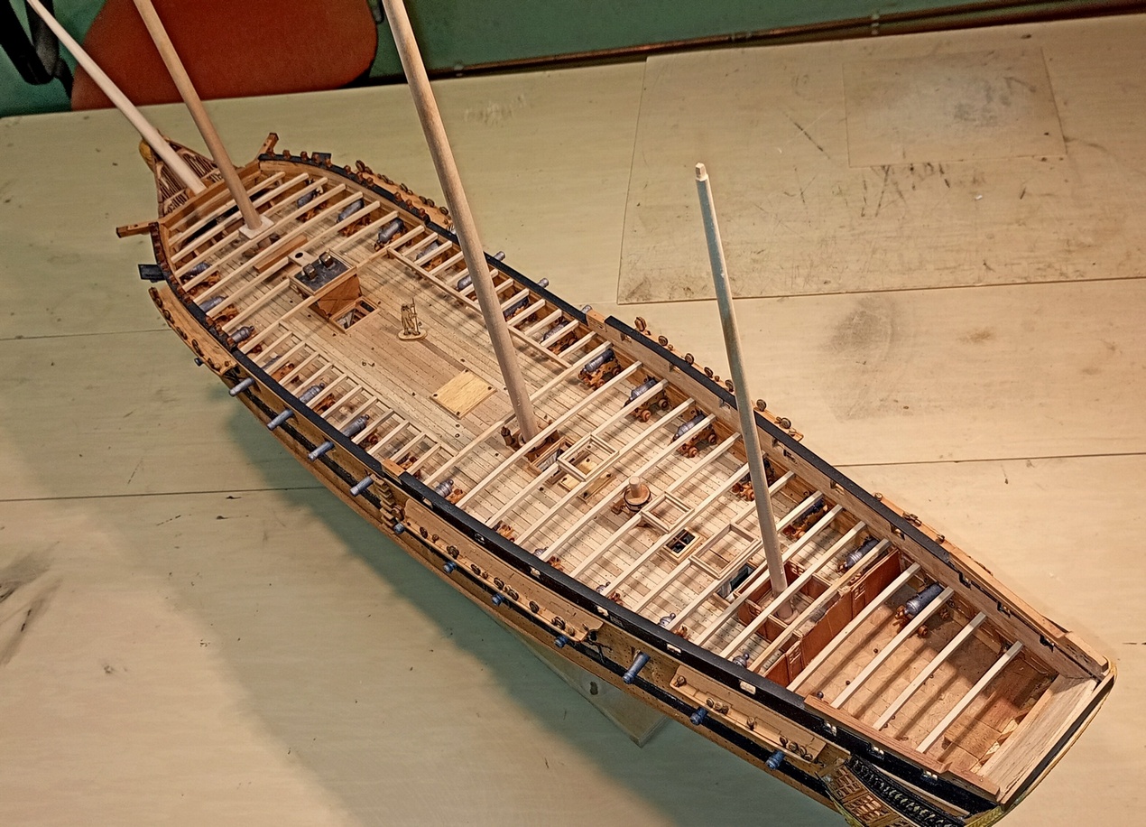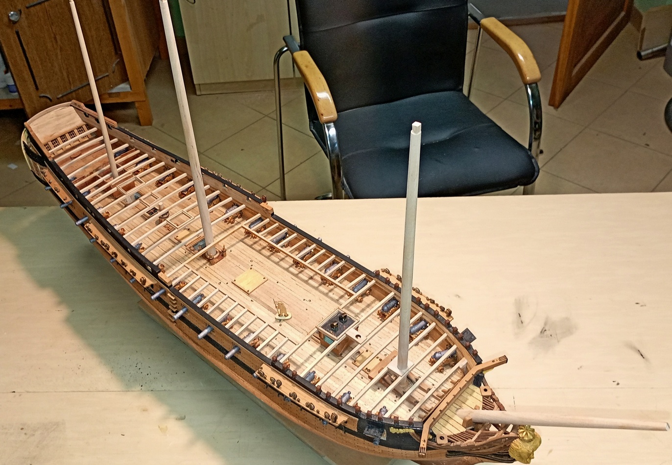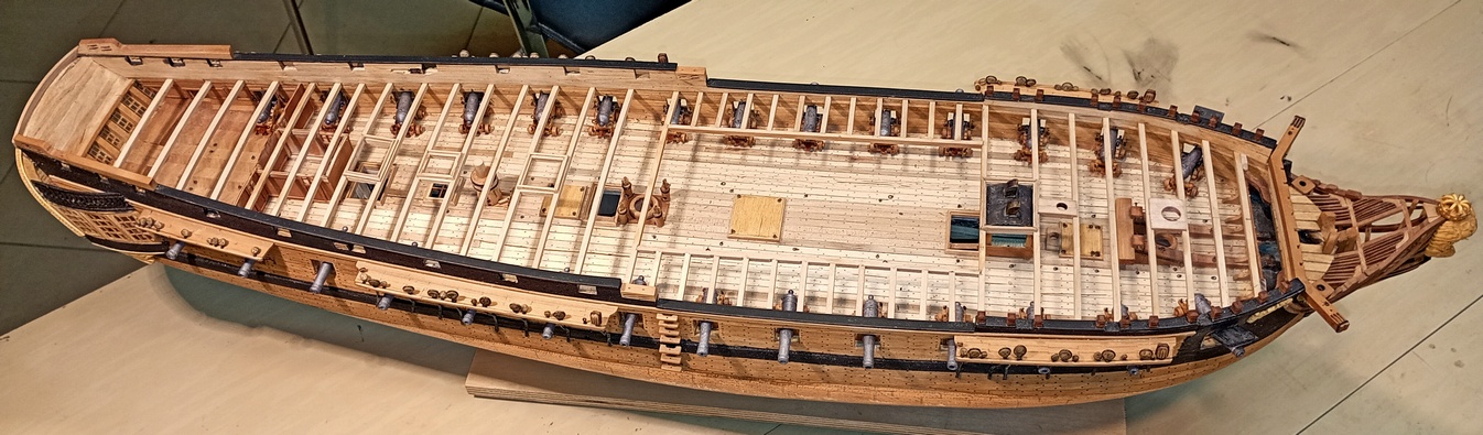 Pokładniki górnego pokładu wklejone. Początkowo planowałem wykonać nie pełne deskowanie górngo pokładu, tak by detale poniżej były lepiej widoczne, ale ostatecznie uznałem, że byłoby to niespójne z ogólną koncepcją zbudowania kopletnego modelu.
