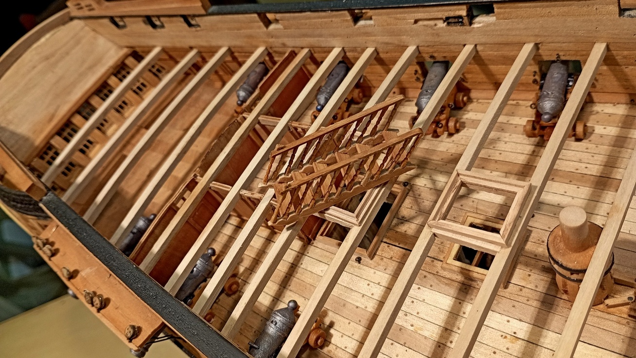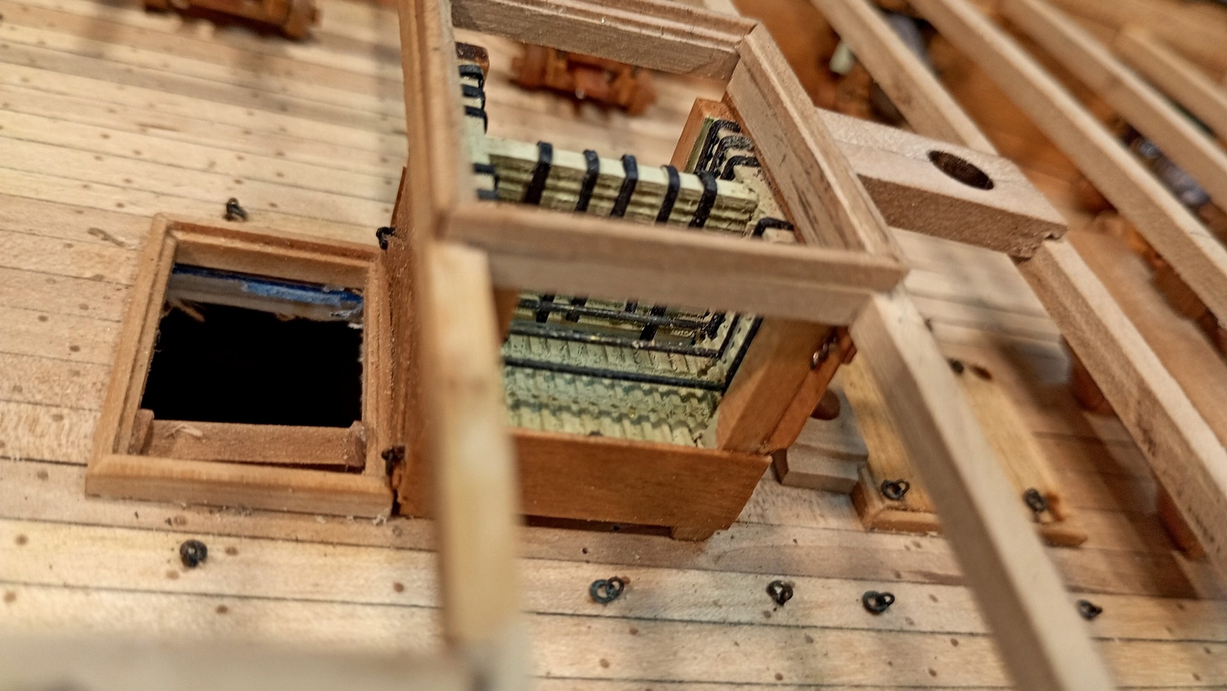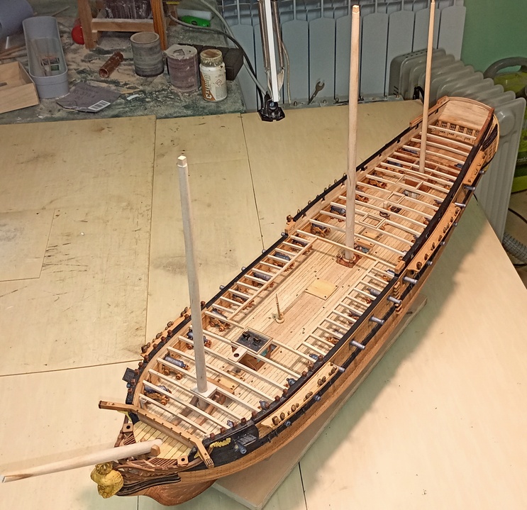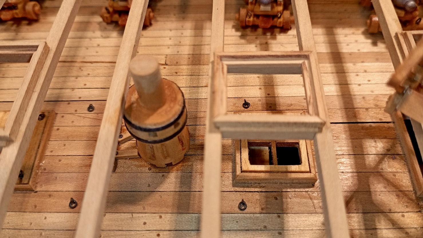 Pokładniki górnego pokładu wklejone. Początkowo planowałem wykonać nie pełne deskowanie górngo pokładu, tak by detale poniżej były lepiej widoczne, ale ostatecznie uznałem, że byłoby to niespójne z ogólną koncepcją zbudowania kopletnego modelu.