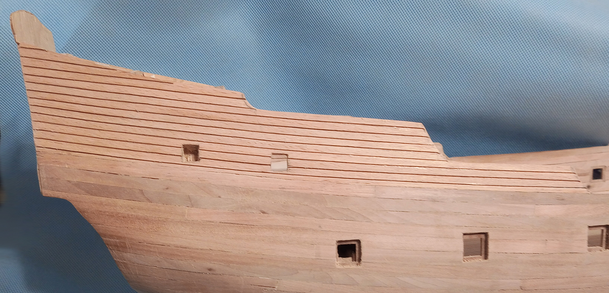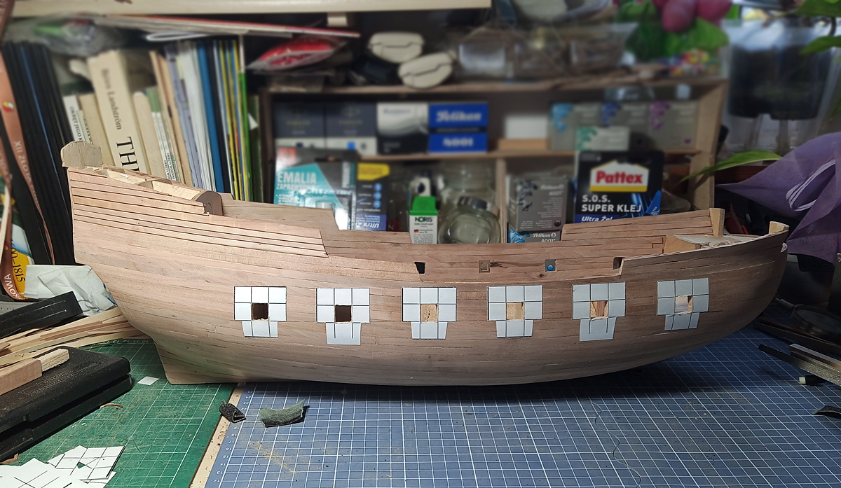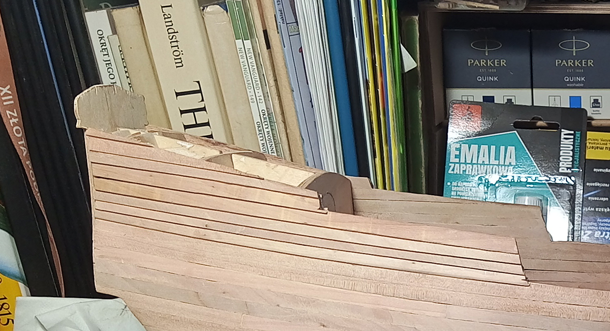 ale coś mi tu nie pasowało. Znów zabrałem się za przeglądanie fotek z modelami z takim poszyciem kasztelu i Eureka… Za wysoko zacząłem przyklejać poszycie na zakładkę, powinno się zaczynać na wysokości końca burty na śródokręciu, a ja zacząłem jeden „ząbek” wyżej. No to trza było znów zrywać i po raz trzeci oklejać kasztel. Tym razem skutecznie.