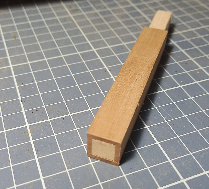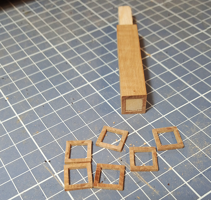 I pomogło, udało się w miarę równe kwadraciki wydłubać. Oczywista, trza było raszpelkiem toto jeszcze pogłaskać aby uzyskać w miarę równe kwadraciki. Potem należało w te dziury wsadzić dodatkowe rameczki. No to skleiłem se listewki w taką kwadratową rurę z zamiarem pocięcia na paski, które utworzą mi potrzebne ramki. Jednak miałem obawę, że jak będę przepychał toto przez krajzegę to może mi się rozlecieć, wszak sklejone jest tylko krawędziami. Więc wzmocniłem toto wkładając w środek listewkę o przekroju kwadratowym dopasowaną do wewnętrznego wymiaru tej mojej konstrukcji.