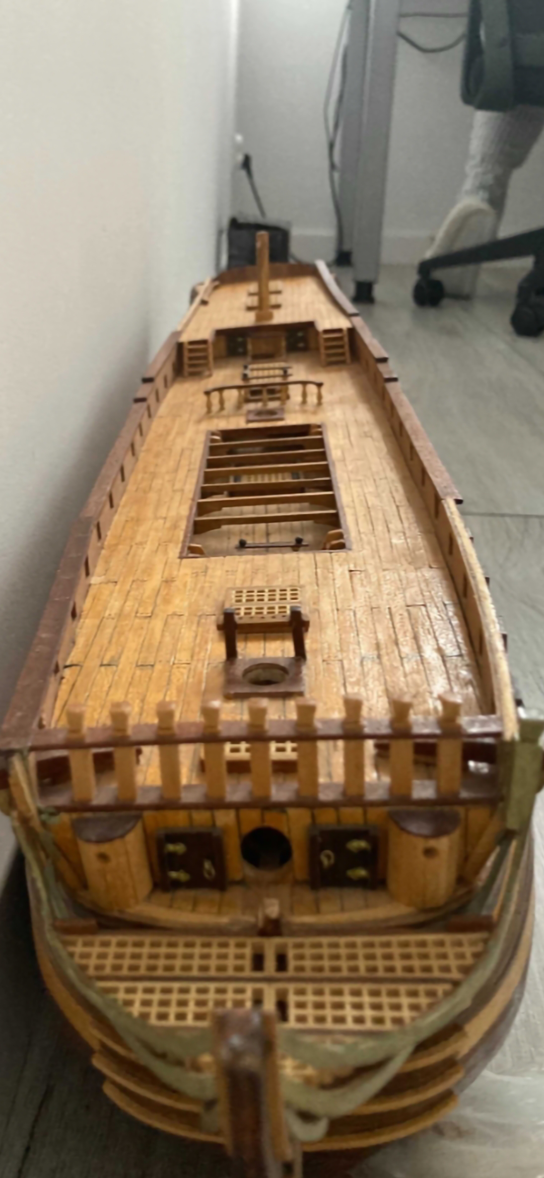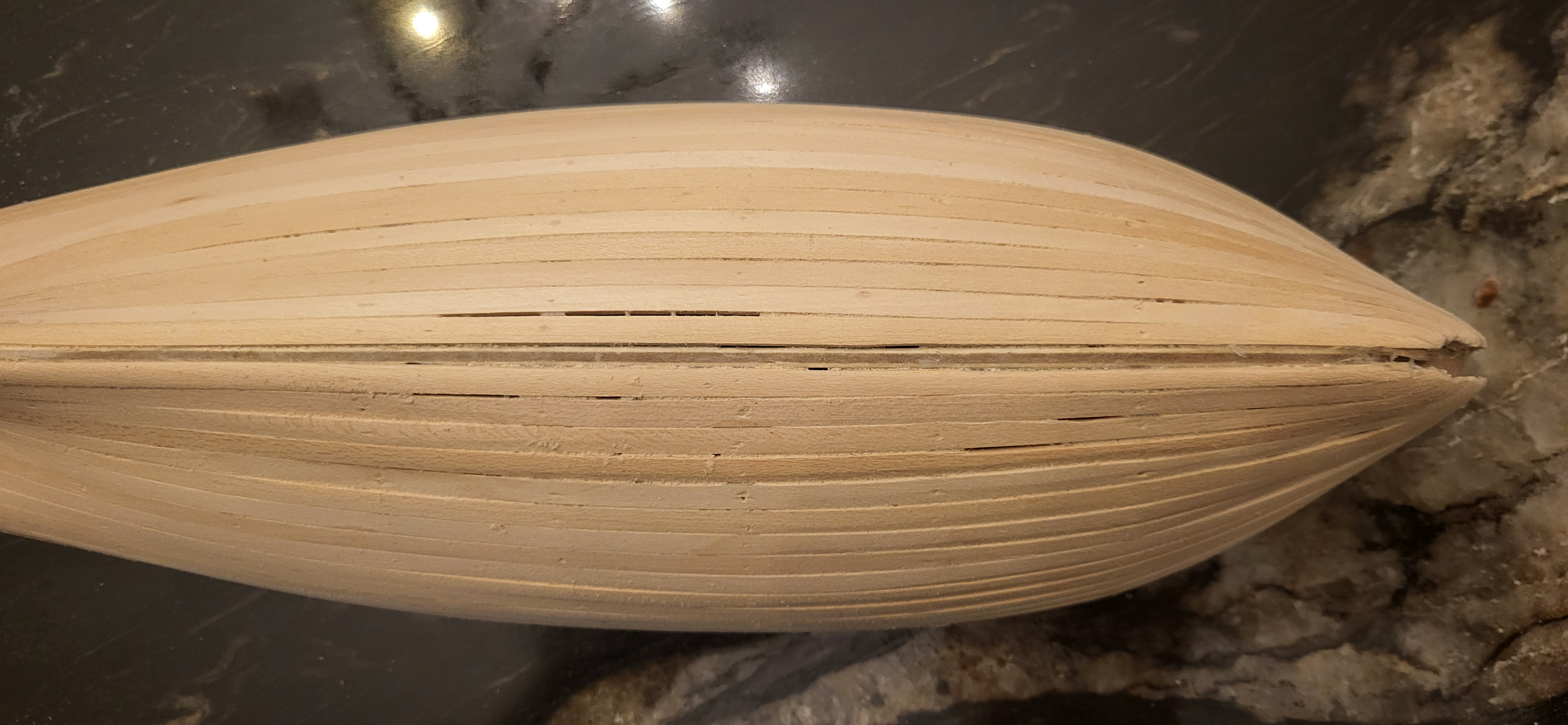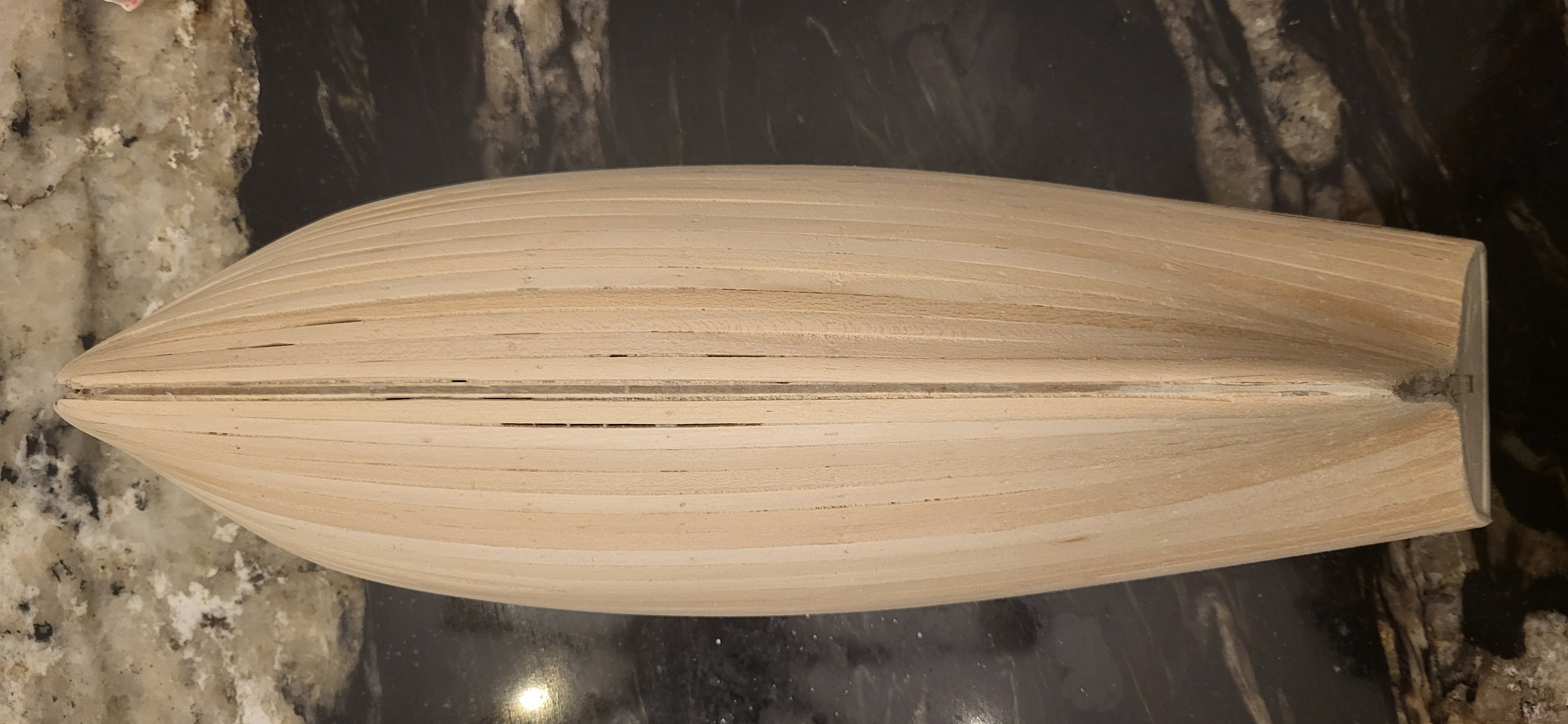 Tymczasem szlifowania dalszy ciąg, nie wiem do jakiego stopnia i kiedy zakończyć bo prawdopodobnie nałożę na to drugie deskowanie czyli poszycie właściwe, ale zabawa fajna :shock: widać szczeliny głównie wcdeseczkach mocniej docinanych - niestety. Prawdopodobnie dam szpachli trochę, następnie bejca, tak bejcy też nie ma w instrukcji na tym etapie, ale myślę, że warto nałożyć bejcę pod kolor poszycia właściwego, jak zle ułoże deseczki na poszyciu właściwym w ciemnym kolorze to nie będzie prześwitywało jasne poszycie. W załączniku obecny efekt. Miłej nocy. PS przy pracach spadł model i uszkodziłem tylne odcinki burt, bez tragedii doklei się a w kolejnym etapie beda tam deseczki więc się usztywni, nawet lepiej dla szlifowania wyszło ale trzeba bedzie naprawić, dobrej nocy. Ps nie jestem jeszcze leniwy na tym etapie ale tak myślę czy poszycie właściwe jest konieczne, nie lepiej to ładnie pomalować po szlifowaniu i szpachlowaniu, no ale jak mus to mus :?