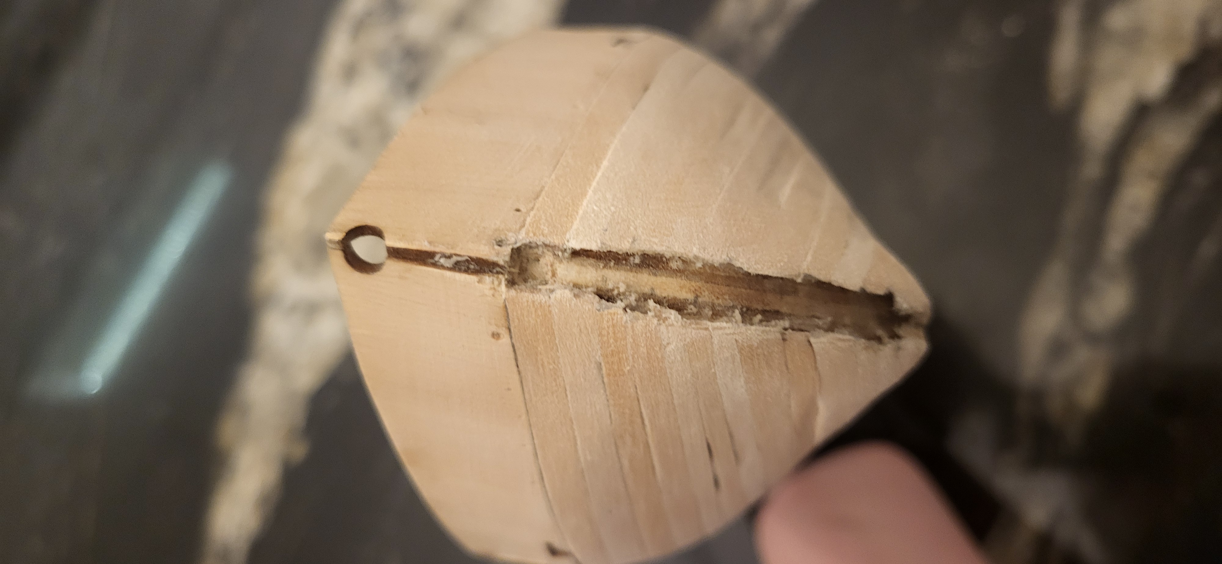 Po wklejeniu stewy dziobowej szczeliny pomiędzy nią a plankami powinieneś wypełnić trocinami zmieszanymi z klejem. Planki właściwe muszą być już dokładnie dopasowane do stewy przed przyklejeniem.
