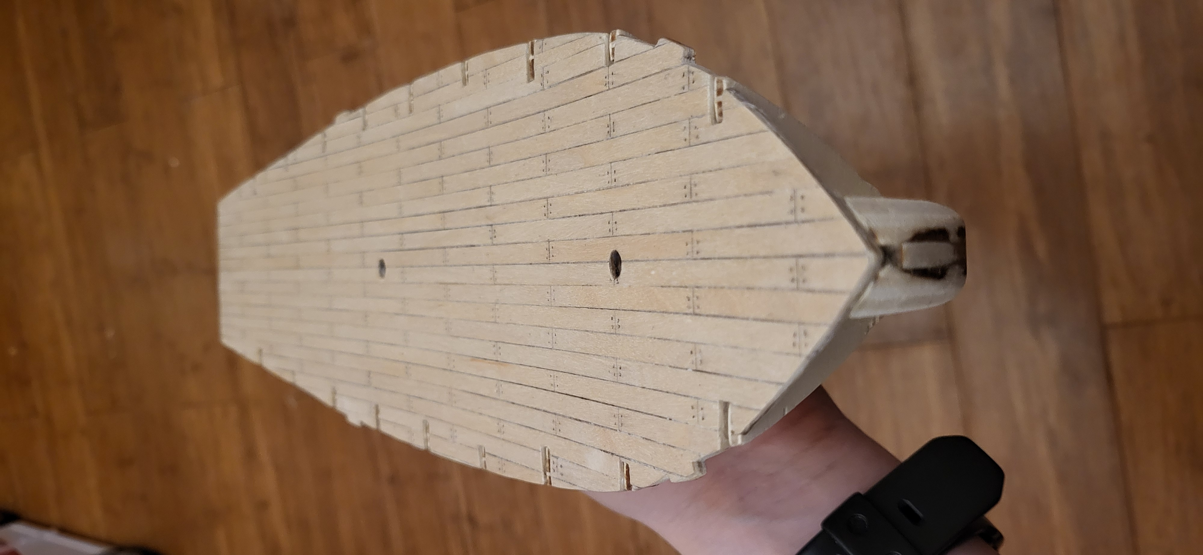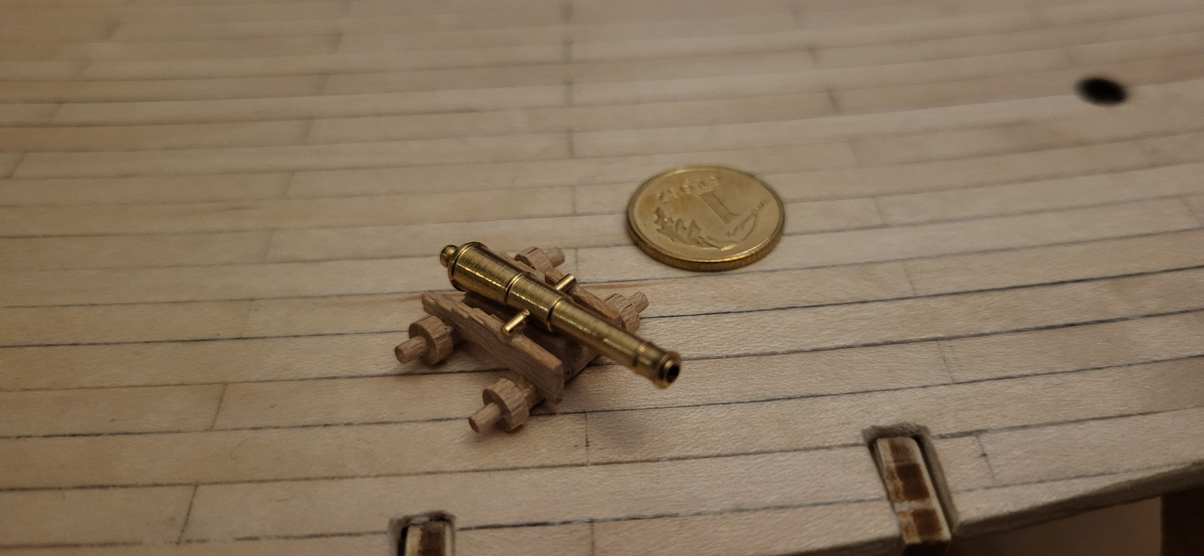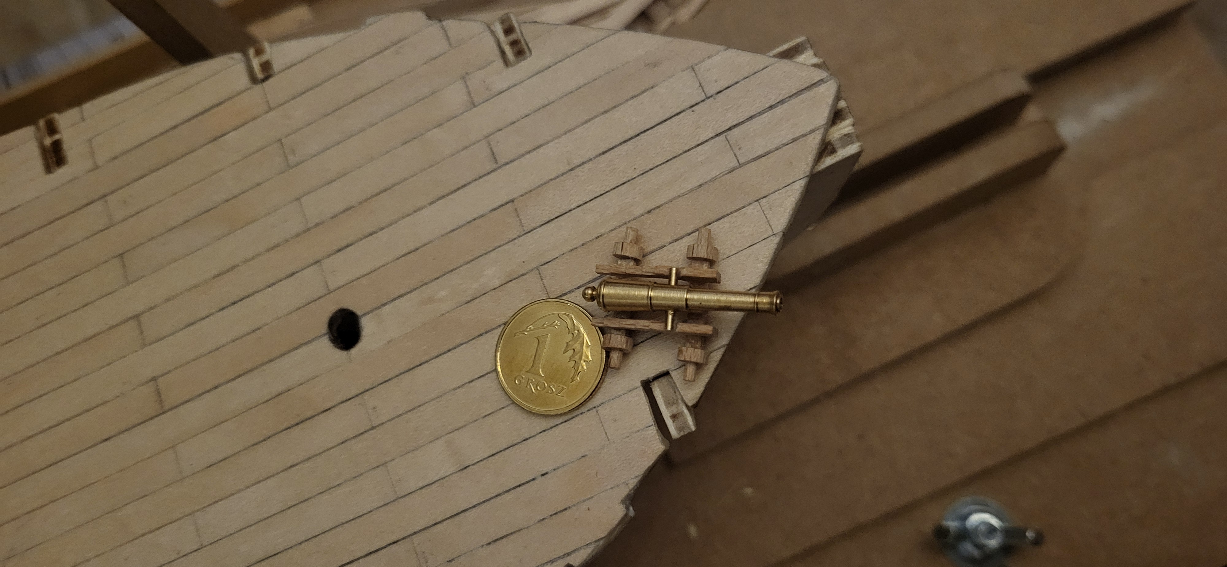 Dodam jeszcze, że planuje po 4 otwory z armatami na każdej burcie. Z wykorzystaniem otworow pod odpływ wody z pokładu, żeby było symetrycznie prawdopodobnie zaślepię jeden otwór, a w kolejnym wykonam otwór pod armate. Pozniej uzupełnie kołkowanie, bo teraz trzeba się zbroić, piratów pełno