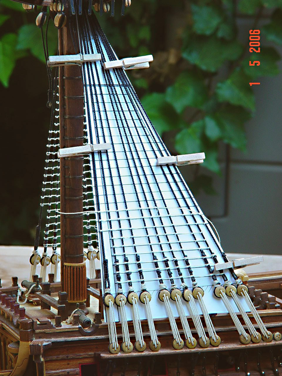Doszedłem do etapu, którego się najbardziej obawiałem ( i nadal tak jest) , t. j. montaż drabinek wantowych. Przy moich wcześniejszych budowach [Victory, Alert, Myflower] nie było z tym problemu: przy małej skali modeli, po prostu podkleiłem cieńsze nitki w poprzek want, i gotowe. Teraz będzie gorzej…