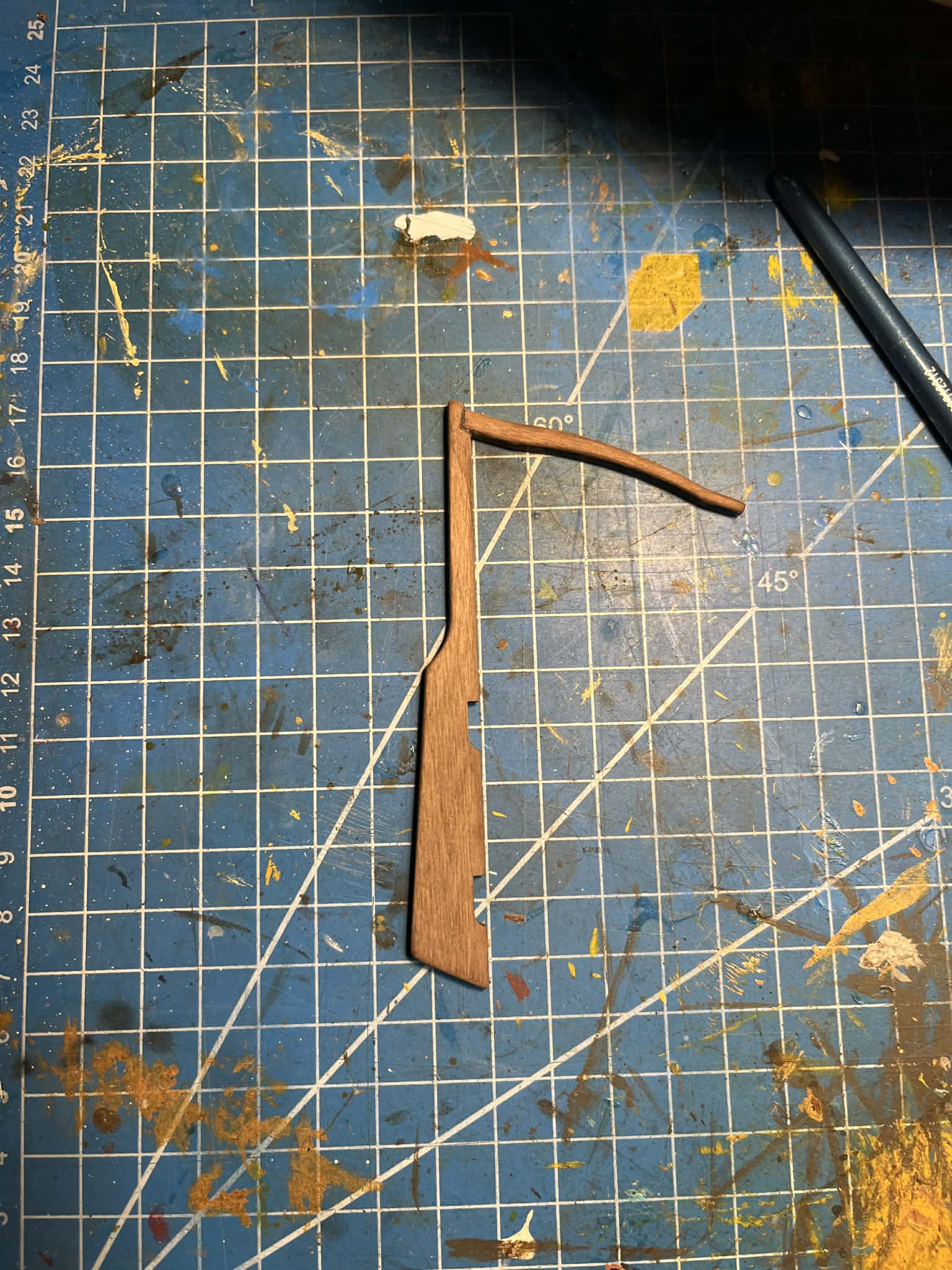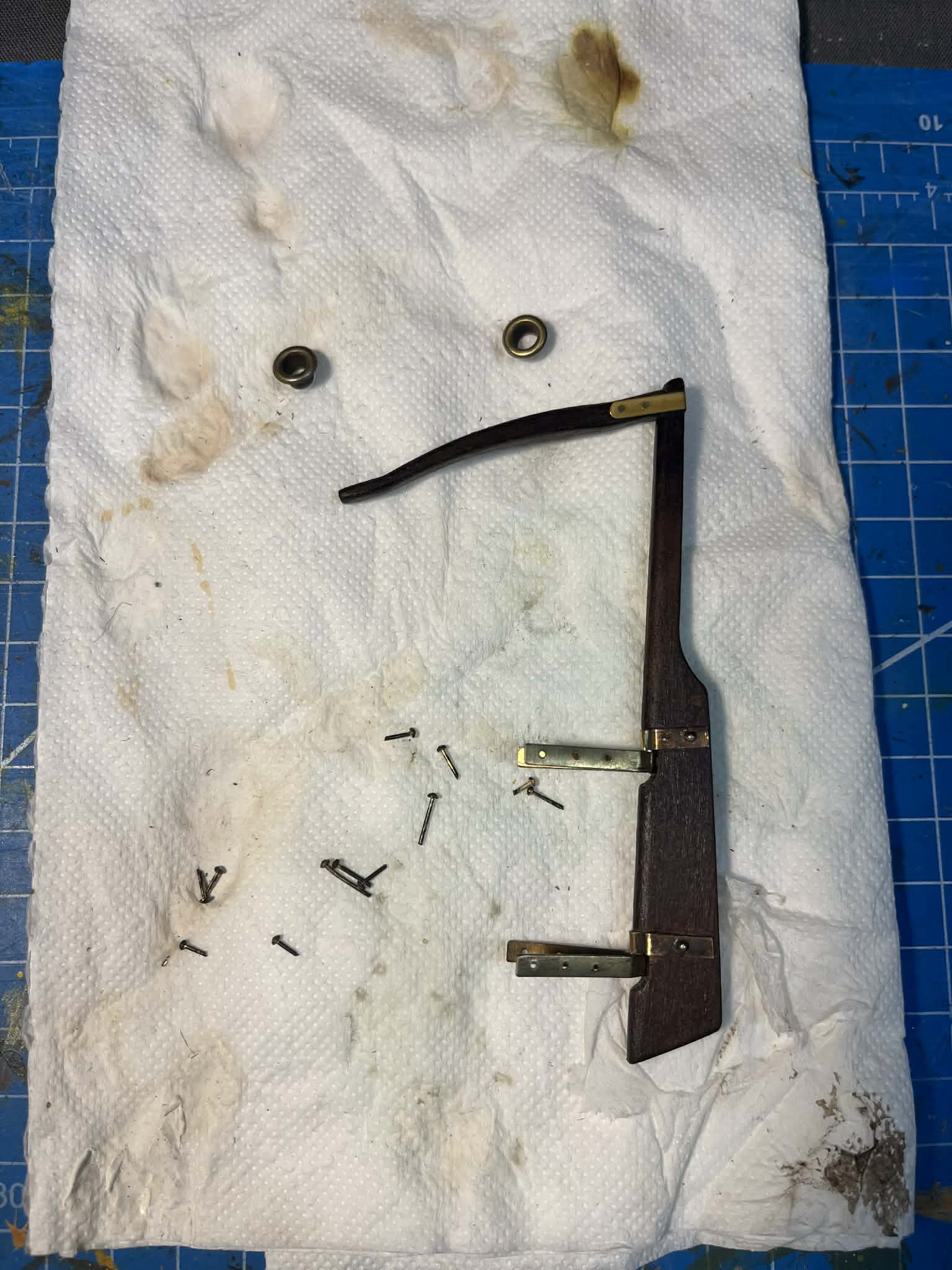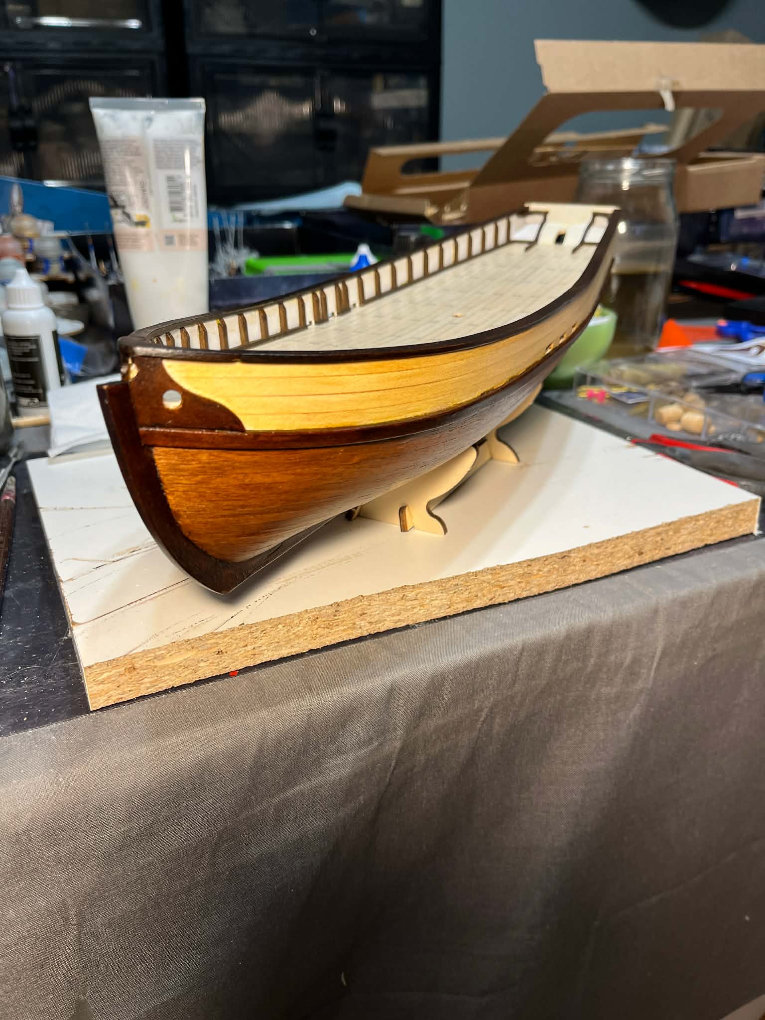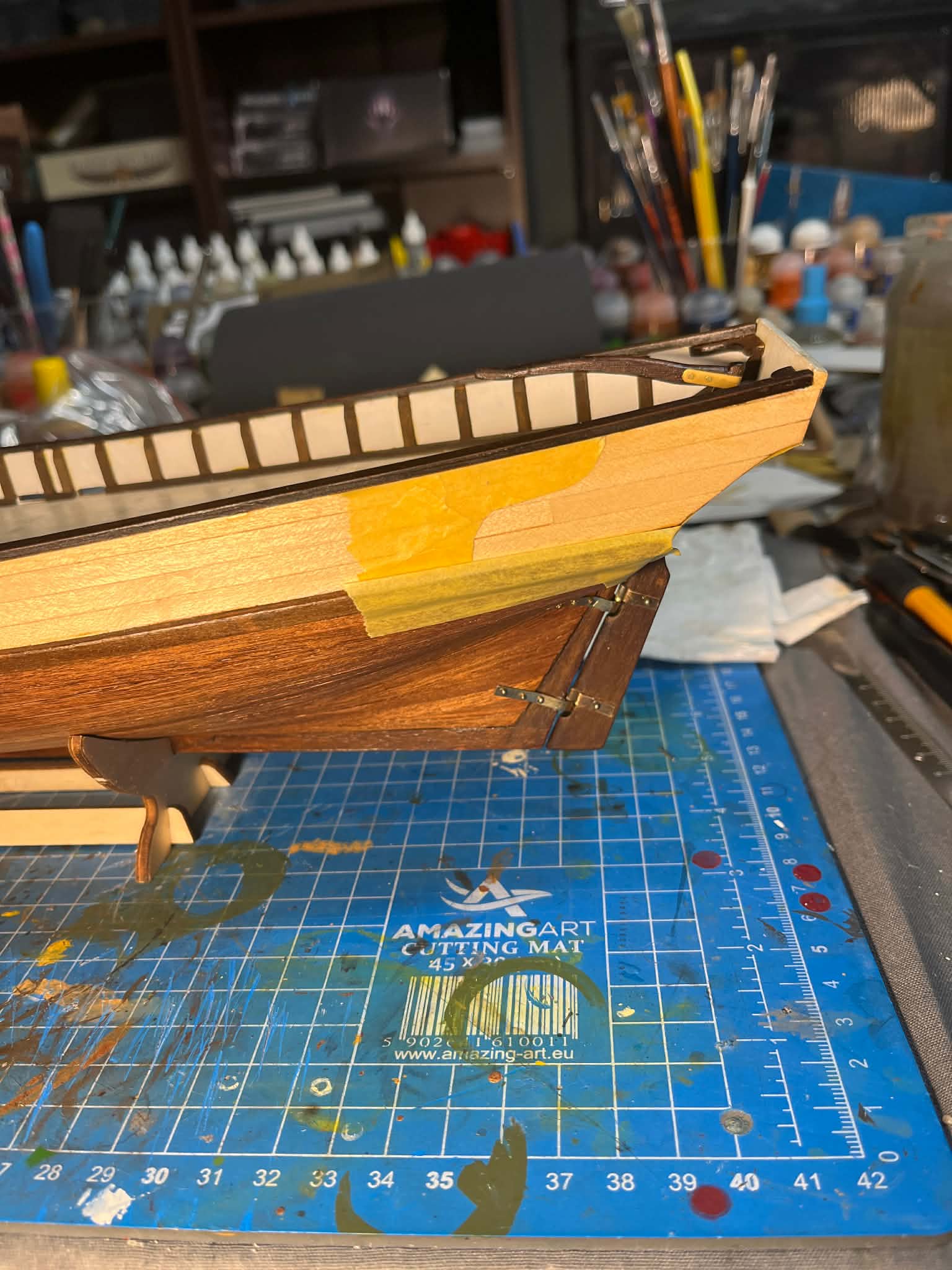Drugi problem okazał się już bardziej problematyczny. Elementy wcześniej bejcowane, a zamontowane na kadłubie bez żadnego zabezpieczenia, po kontakcie z akrylowym lakierem rozcieńczanym wodą zaczęły puszczać kolor i barwić lakier. Malowałem dużym pędzlem i w efekcie zabrudziłem jaśniejsze elementy kadłuba. Nauczka na przyszłość: bejca + lakier zawsze przed montażem. W tym przypadku używałem bejcy Occre, ale podobnie zachowują się również standardowe bejce z marketów budowlanych.