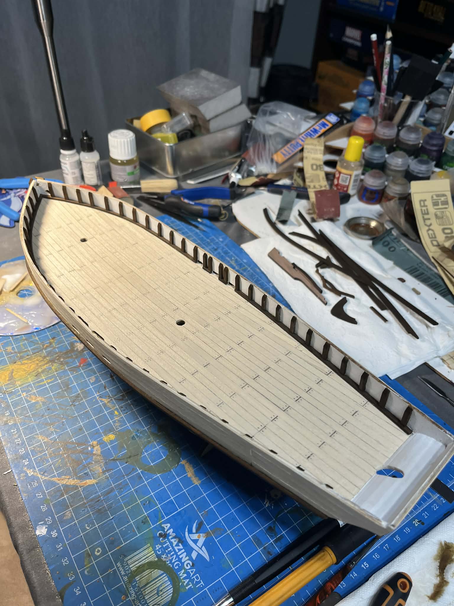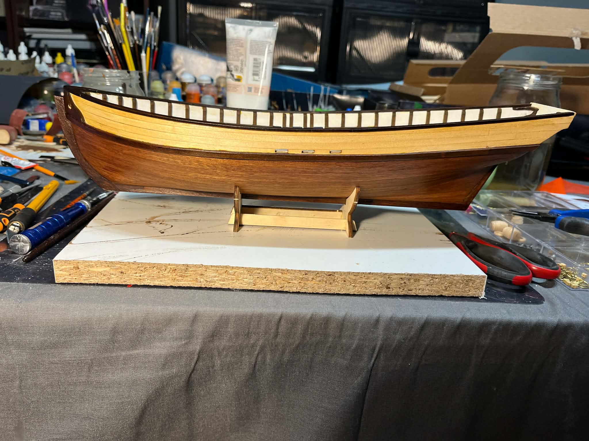 Na tym etapie wstawiłem sztuczne przedłużenia wręg w rejonie burt i przeszedłem do lakierowania całego kadłuba. Tutaj pojawiły się dwa problemy.