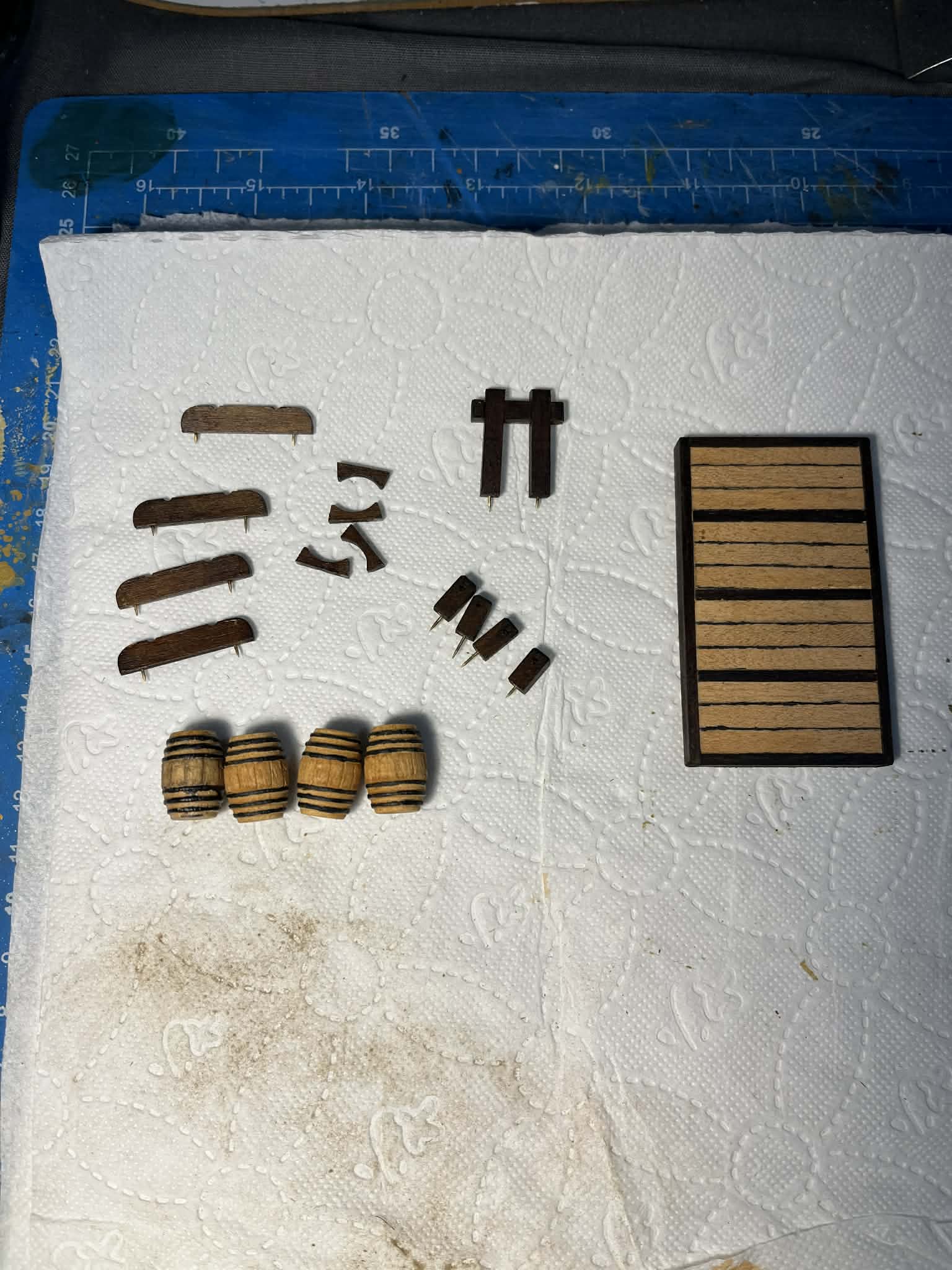 Marker dodatkowo mocno brudzi drewno i bardzo trudno to później skorygować, więc raczej nie będę do niego wracał. Na beczkach dodatkowo naciąłem nożykiem linie między deskami — gładkie powierzchnie nie przypadłu mi do gustu. Do wszystkich istotnych elementów dodałem również metalowe gwoździe, żeby poprawić trwałość mocowania do kadłuba.