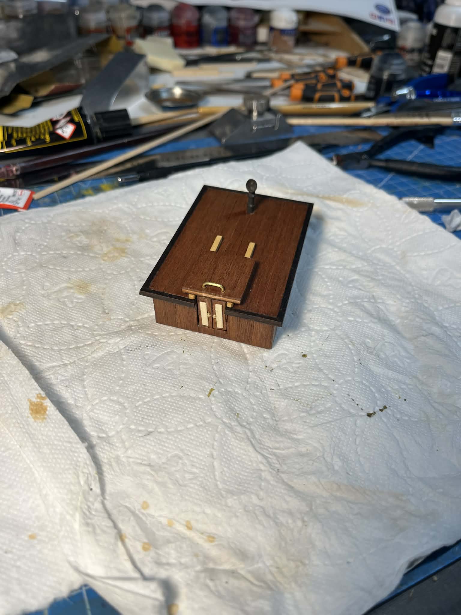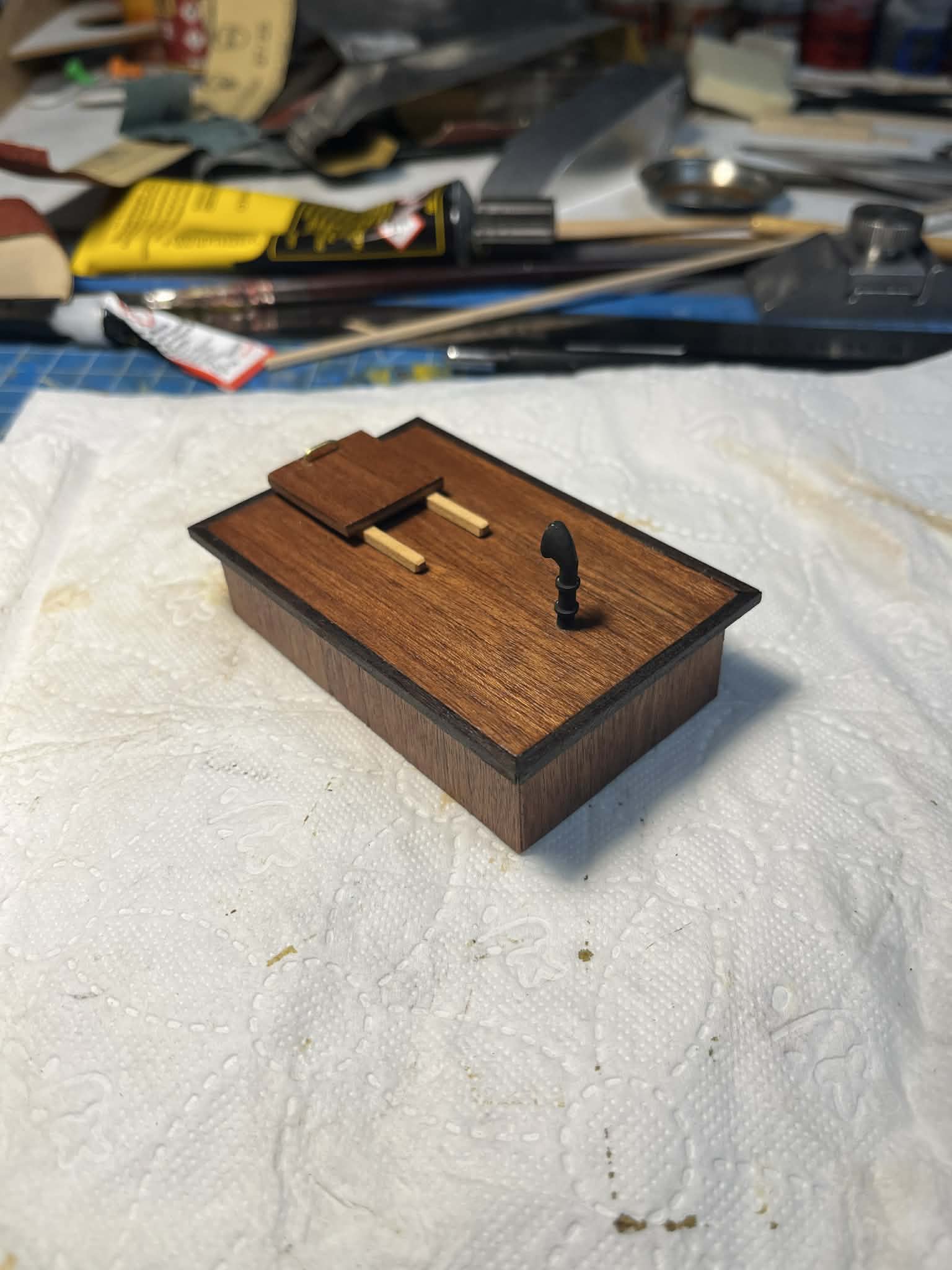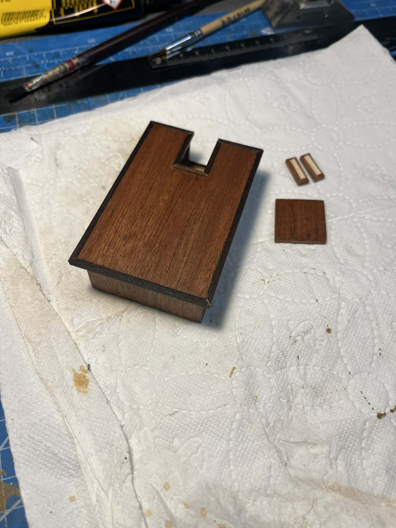 Zgodnie z planami przygotowałem pokładówkę - nie wiem jak dokładnie ten element nazwać: kiosk? rufówka? sterówka? Może ktoś z bardziej doświadczonych kolegów podpowie. Do klejenia płaskich elementów używałem kleju kontaktowego i kleju PVA. Elementy drewniane zabejcowałem kolorem Sappeli, obrzeża Walnutt, prowadnicę JasnyDąb, Polakierowałem przed połączeniem różnych kolorów. Dogiąłem pręcik zgodnie z instrukcjami. Zrobiłem też ruchome drzwiczki.