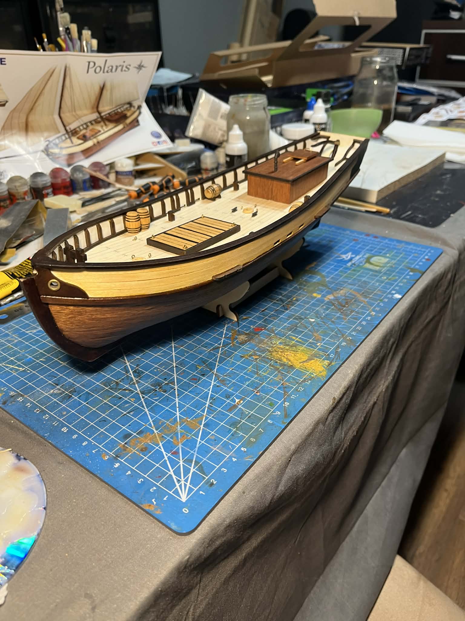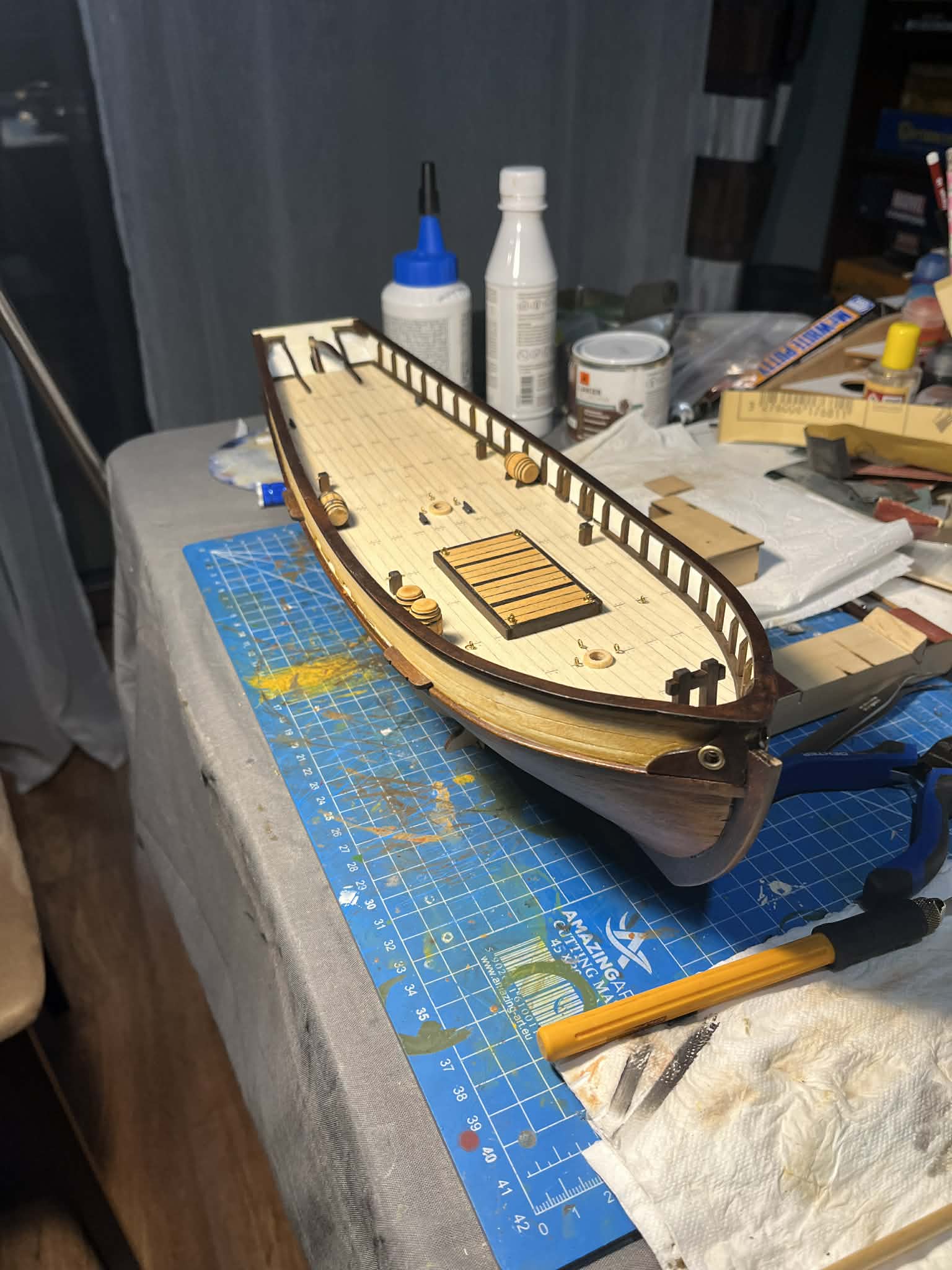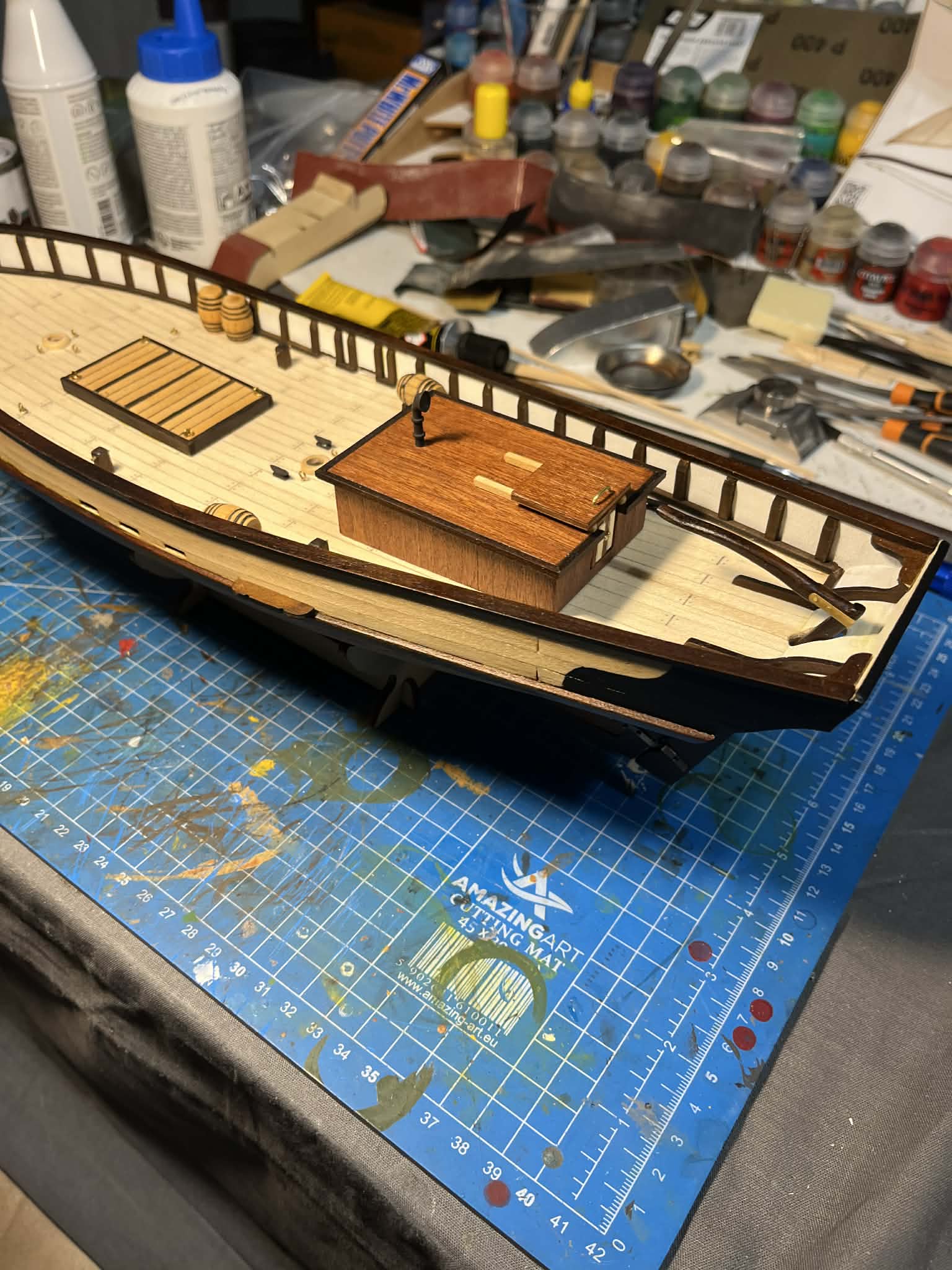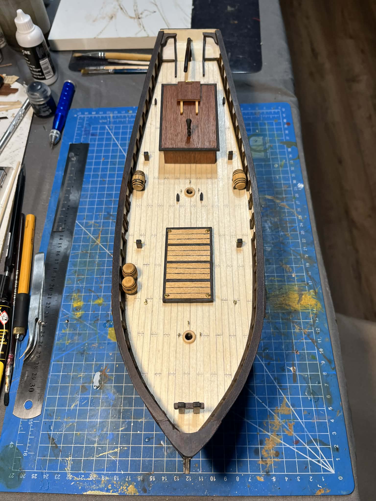 Finalnie zamontowałem sterówkę na pokładzie - efekt po tym tygodniu można zobaczyć na załączonych zdjęciach. Zostały jeszcze jakieś drobiazgi na pokładzie i powoli będę przechodził do takielunku - jufersy, bloczki i maszty.