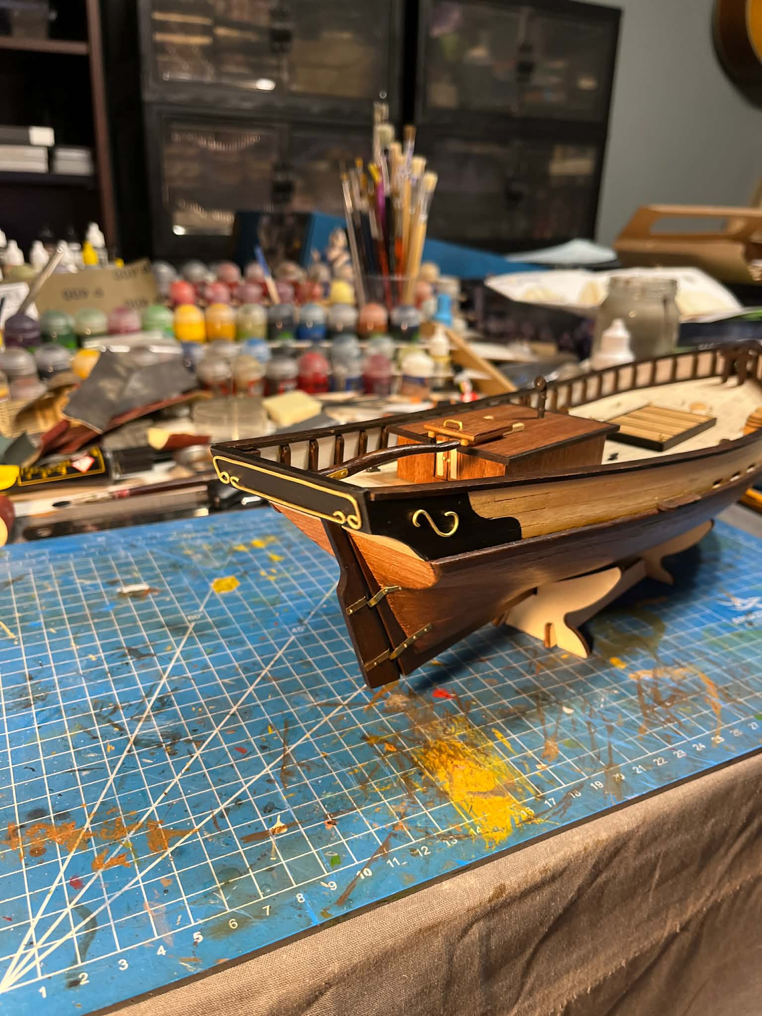 Finalnie zamontowałem sterówkę na pokładzie - efekt po tym tygodniu można zobaczyć na załączonych zdjęciach. Zostały jeszcze jakieś drobiazgi na pokładzie i powoli będę przechodził do takielunku - jufersy, bloczki i maszty.