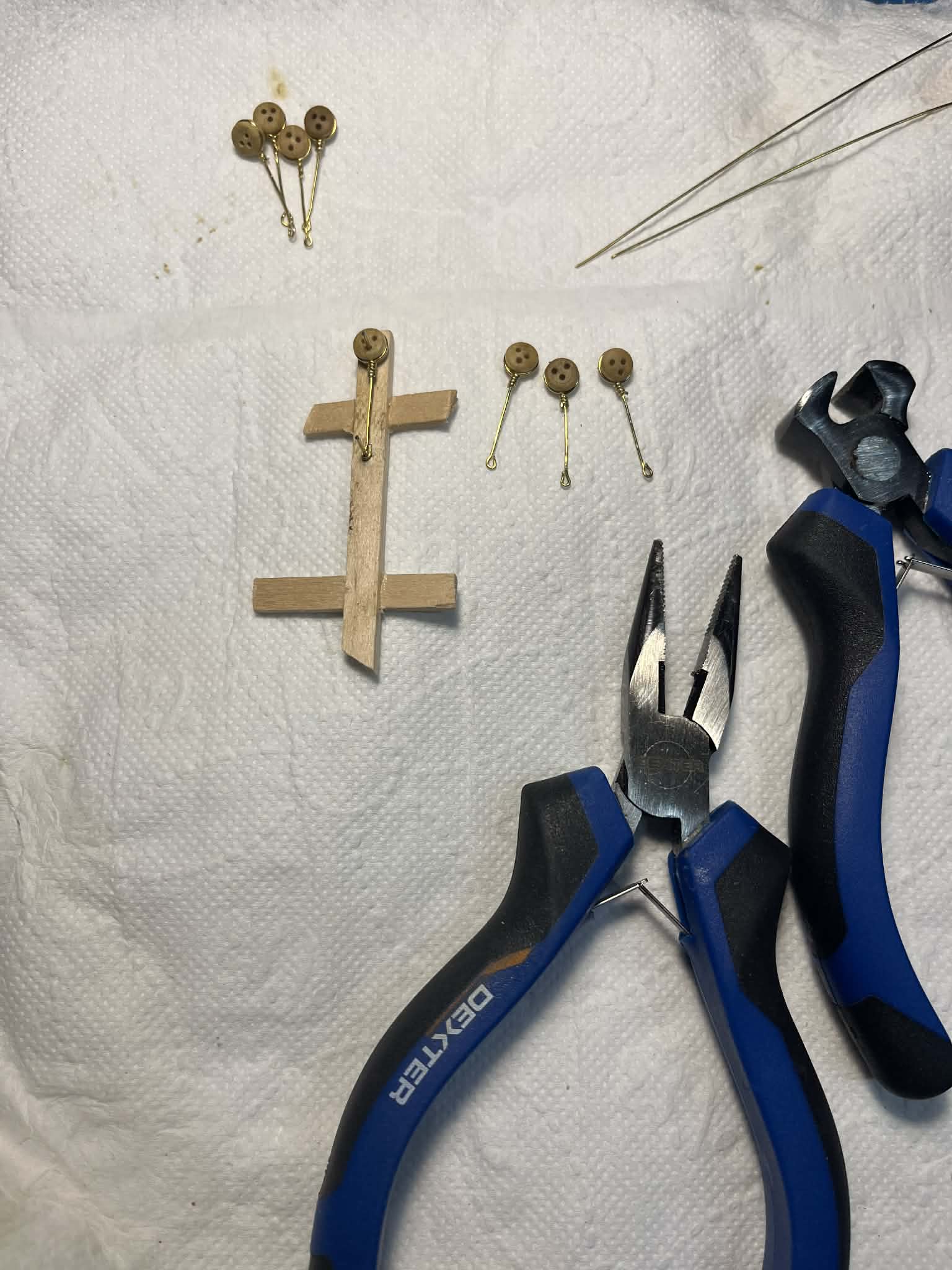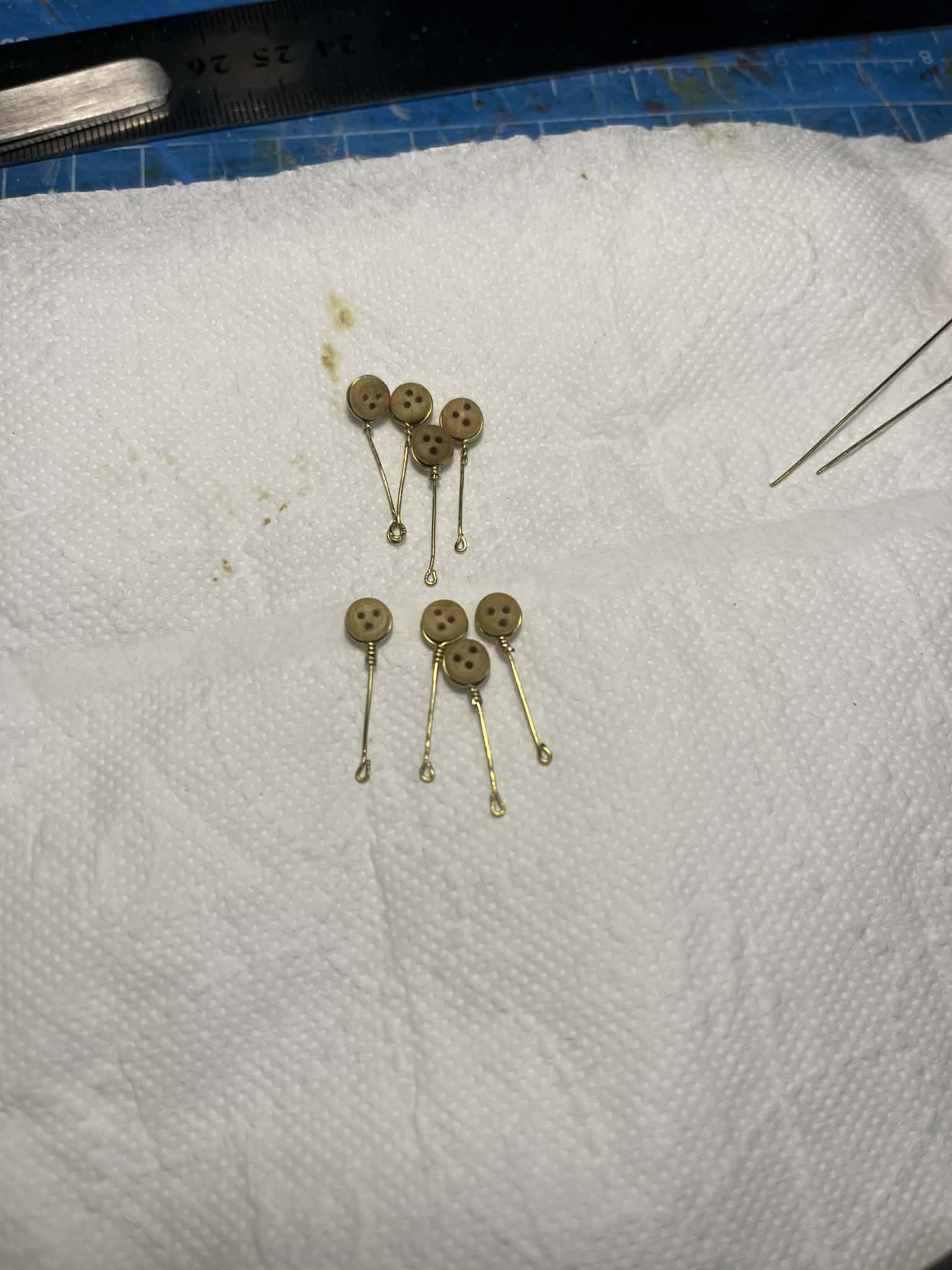 Stworzyłem sobie proste narzędzie do wiązania drucików wokół jufersów. Na ostatnich miałem już całkiem niezłą wprawę i wyszły nieźle. Poczytałem trochę o sposobach mocowań bo burty i dowiedziałem się, że takie jak zastosowano w tym modelu nie istnieją. Zapewno wprowadzono je w tym modelu celem uproszczenia konstrukcji. Taka wiedza będzie na pewno pomocna przy kolejnych projektach.